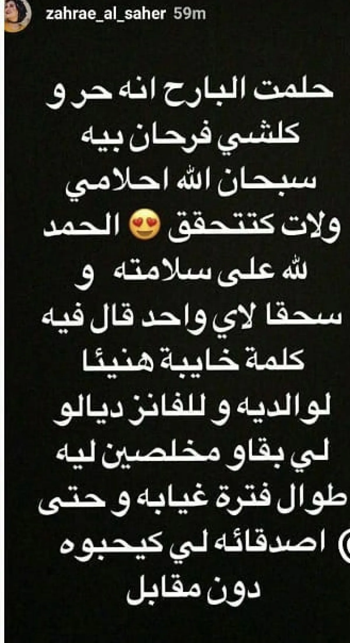 زهرة الساهر أشارت إلى أنها حلمت  بحريته وأن حلمها تحقق من خلال بوست نشرته عبر حسابها على "إنستا ستوري"