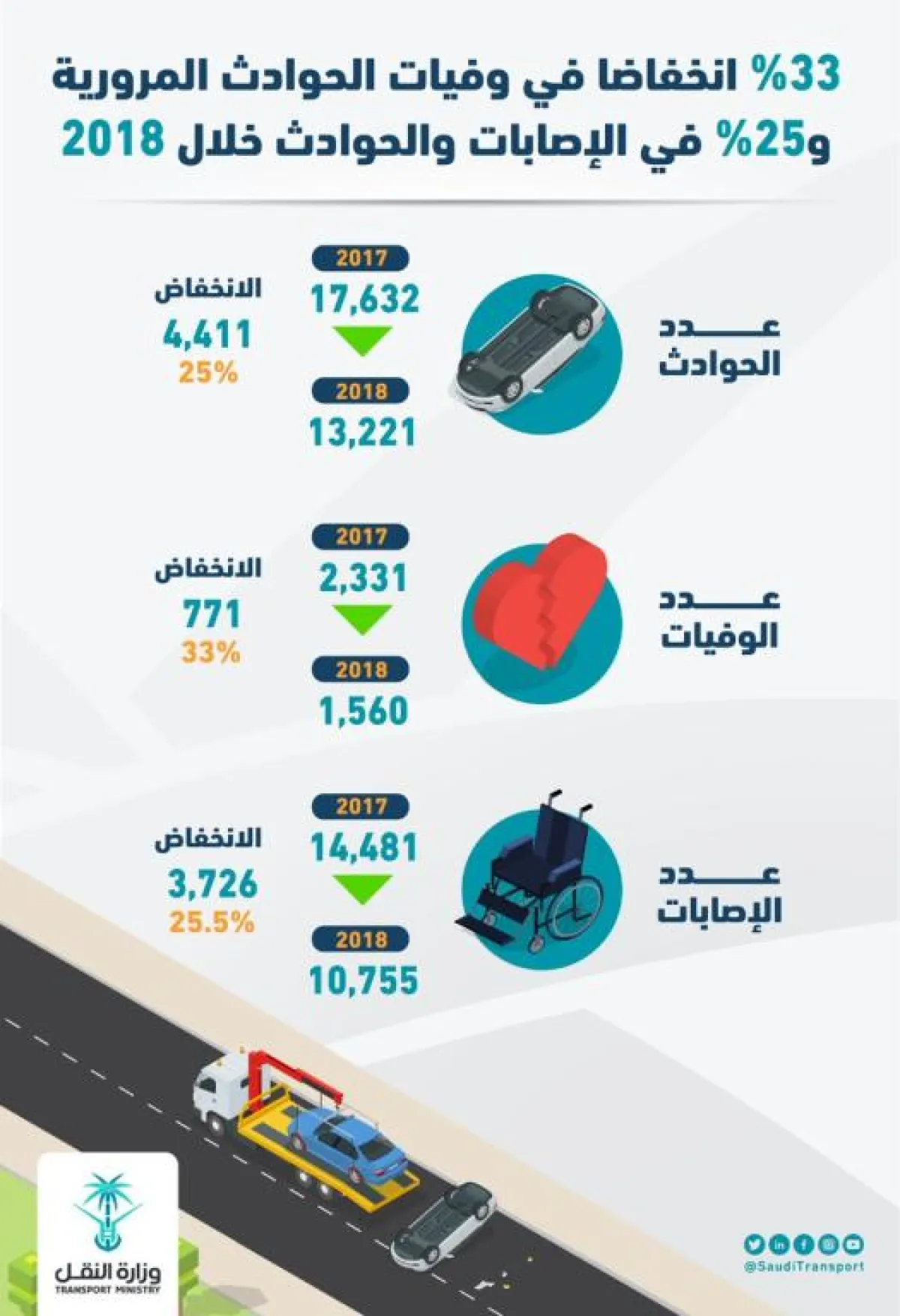 أعلنت وزارة النقل السعودية عن انخفاض كبير في نسبة عدد وفيات الحوادث المرورية على الطرق التابعة لها في المملكة، وطولها 68 ألف كلم إلى أكثر من نسبة 33% خلال عام 2018 مقارنة بعام 2017.
