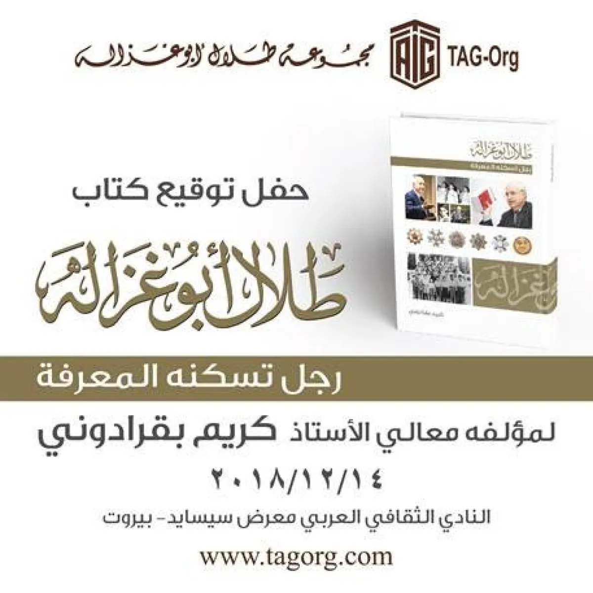 يوقع معالي الأستاذ كريم بقرادوني كتابه الجديد بعنوان "طلال أبوغزاله.. رجل تسكنه المعرفة"، خلال حفل يعقد بحضور سعادة الدكتور طلال أبوغزاله، في جناح النادي الثقافي العربي في الرابع عشر من كانون أول المقبل، ضمن معرض بيروت العربي الدولي للكتاب في نسخته الـ 62، بحضور نخبة من الشخصيّات السياسيّة والثقافية والإعلاميّة.