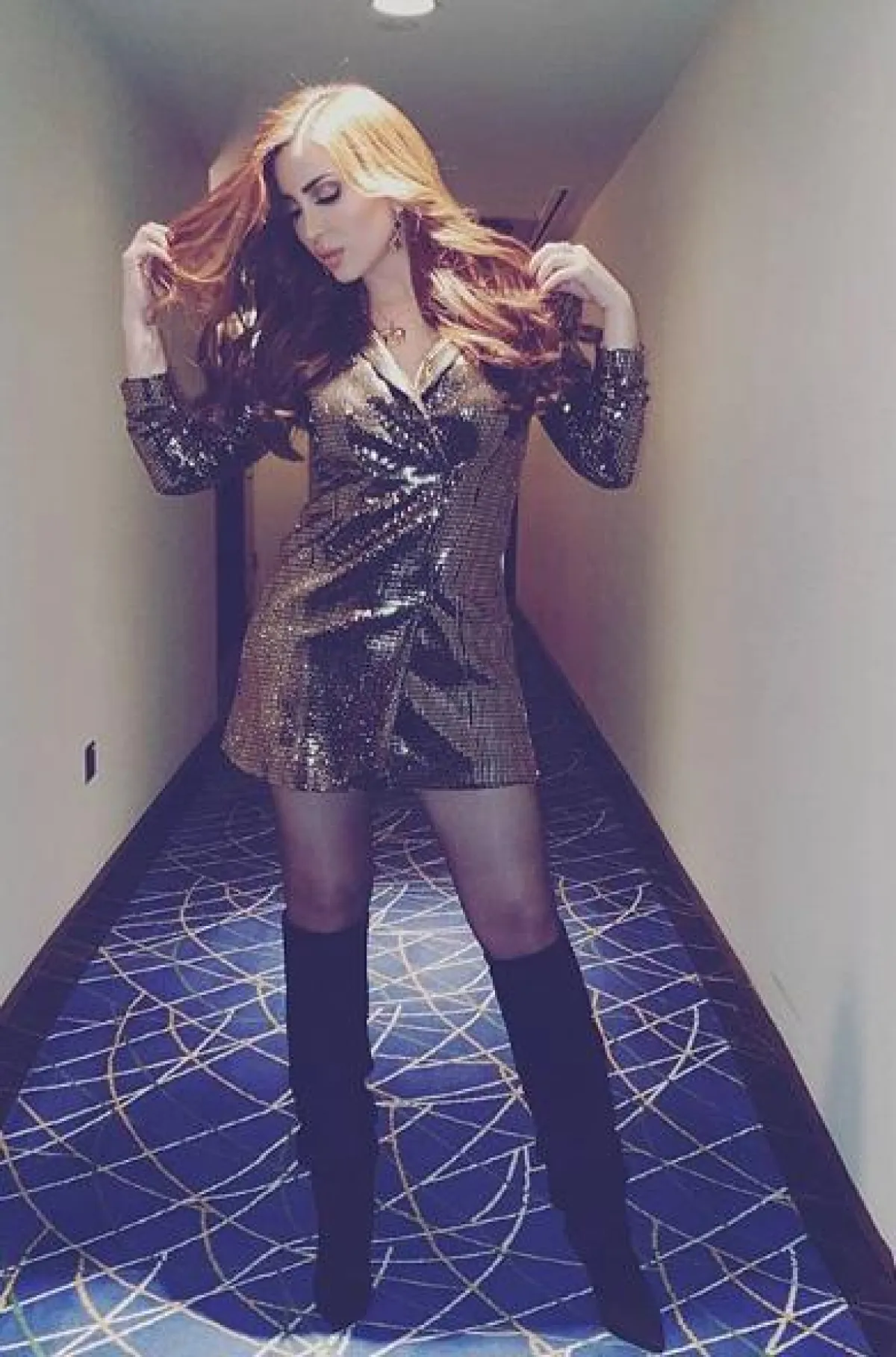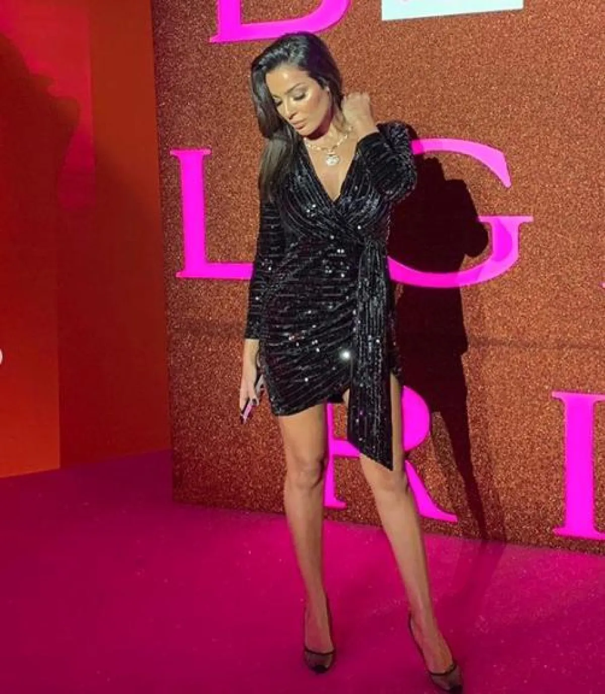 أما في حال رغبتِ أن تحتفلي باللون الذهبي، فمن الممكن أن تستوحي من اطلالة نسرين طافش التي اختارتها مؤخرًا وكانت عبارة عن فستان قصير بقصة البليزر باللون الذهبي، نسقت معه جزمة عالية وصل طولها أعلى حد الركبة باللون الأسود من “سانت لوران” Saint Laurent.