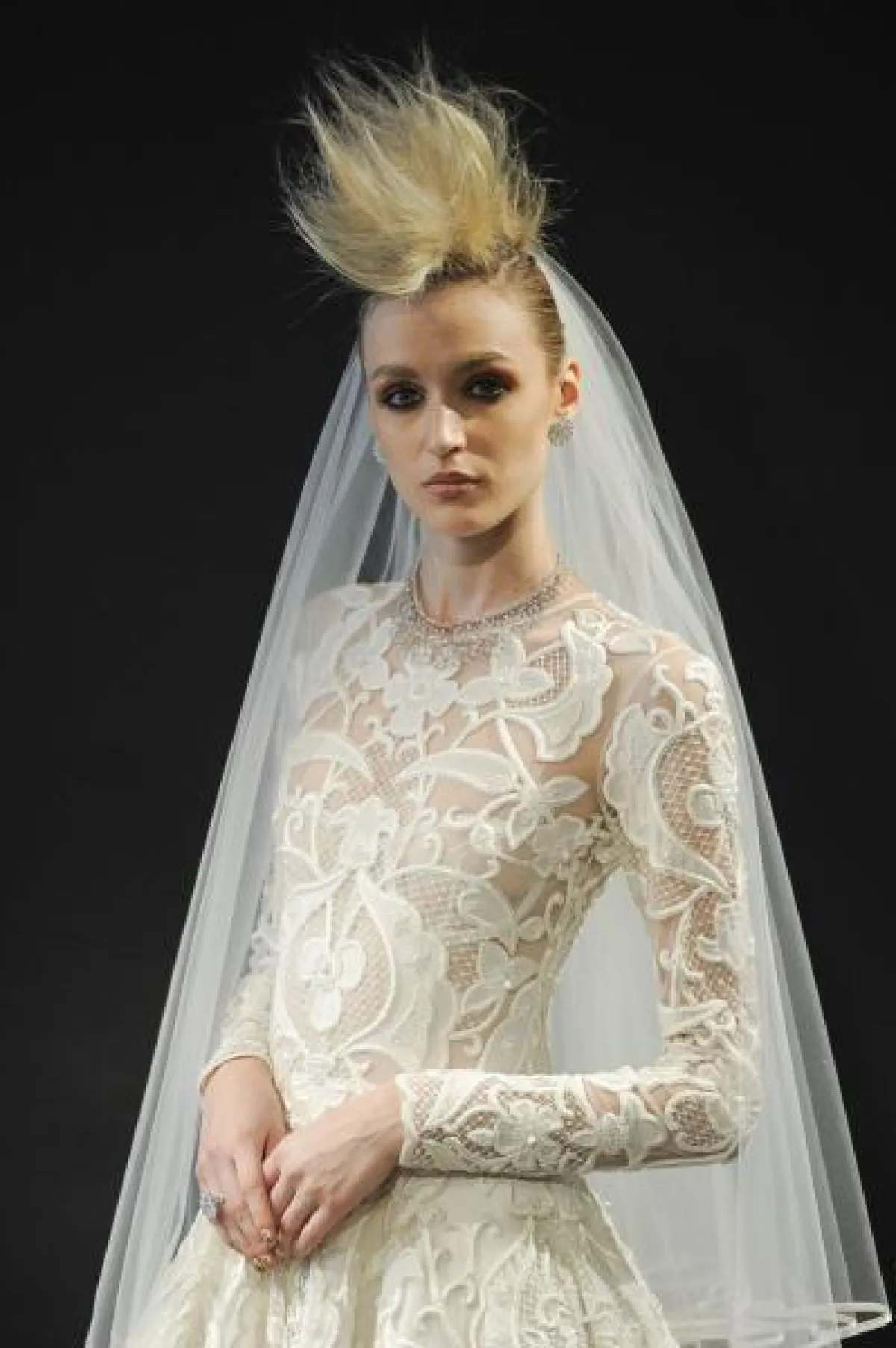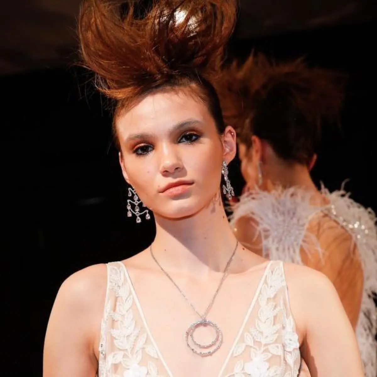برزت الأقراط العصرية بتصميم الوردة باللون الأبيض والتي تنسدل منها الشراشيب لدى ماركة Yumi Katsura، أيضًا ارتدت عارضات بيرتا Berta أقراط الشراشيب ولكن المعدنية والمرصعة بالفصوص البرّاقة.