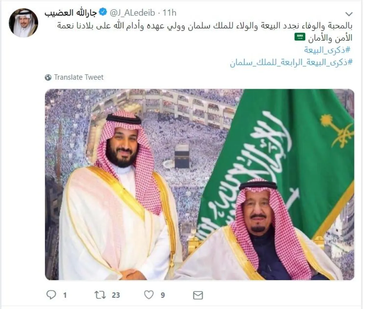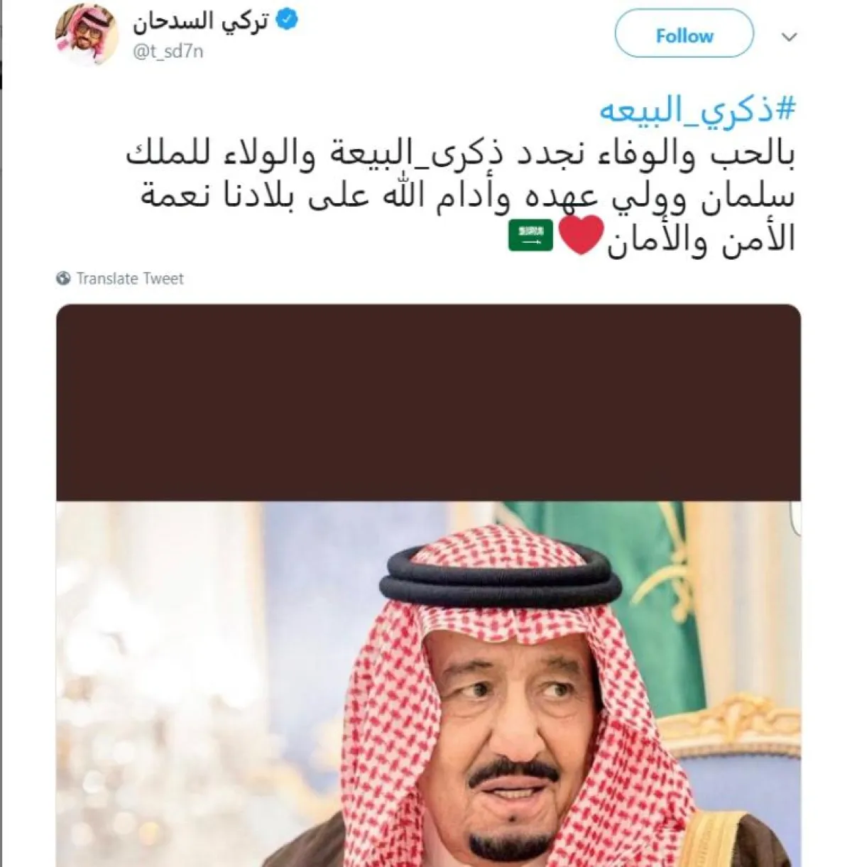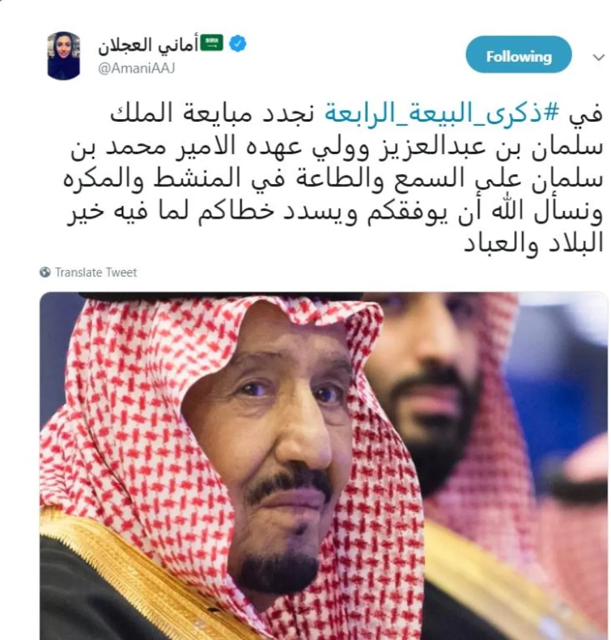 بينما غرد الأمير سعود بن سلمان قائلاً: "في ذكرى البيعة الرابعة، نسأل الله أن يطيل في عمر مولاي الملك سلمان، وسيدي ولي عهده الأمين، وأن يديم الأمن والأمان على بلادنا الغالية".