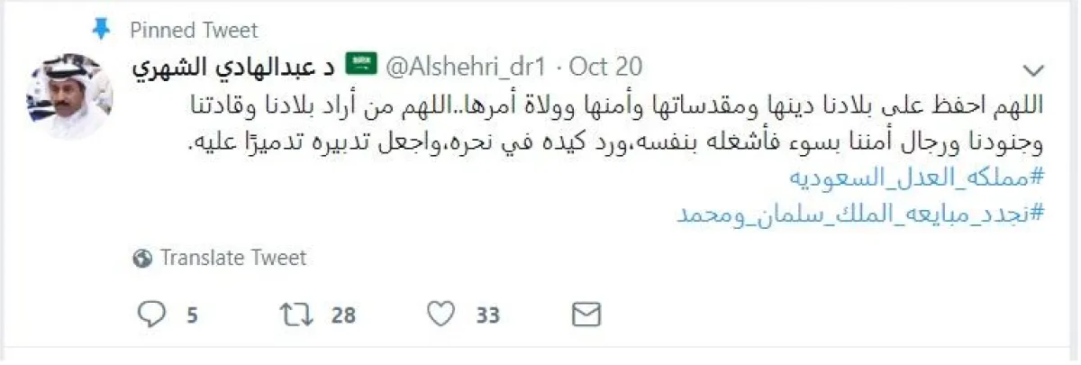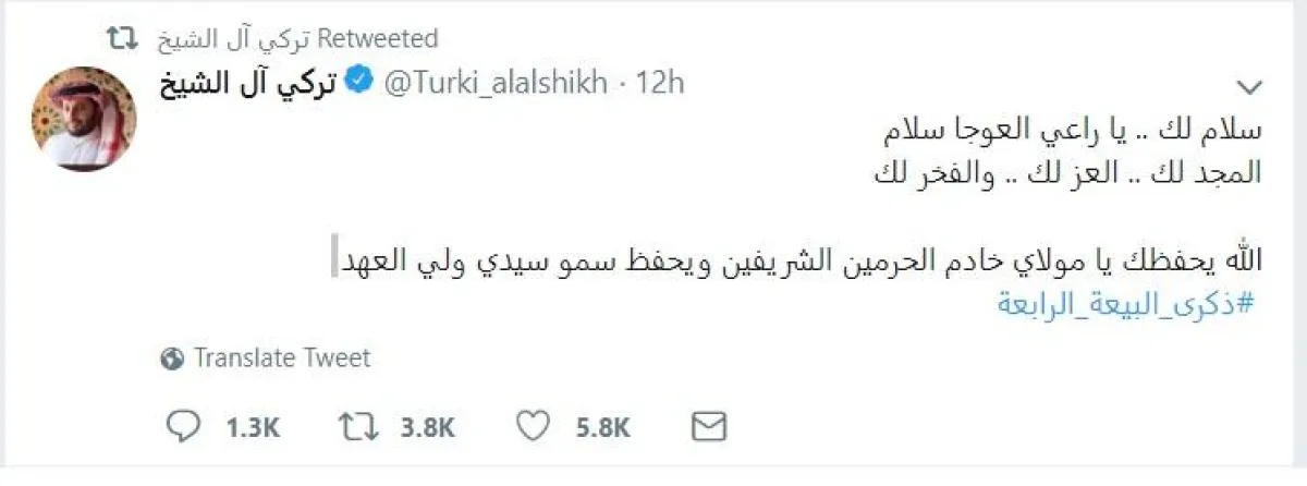 أما تركي آل الشيخ، المستشار في الديوان الملكي، رئيس مجلس إدارة الهيئة العامة للرياضة واللجنة الأولمبية العربية السعودية والاتحاد الرياضي للتضامن الإسلامي والاتحاد العربي لكرة القدم، فغرد: "سلام لك.. يا راعي العوجا.. سلام المجد لك.. العز لك .. والفخر لك.. الله يحفظك يا مولاي الملك سلمان، ويحفظ سيدي ولي العهد".