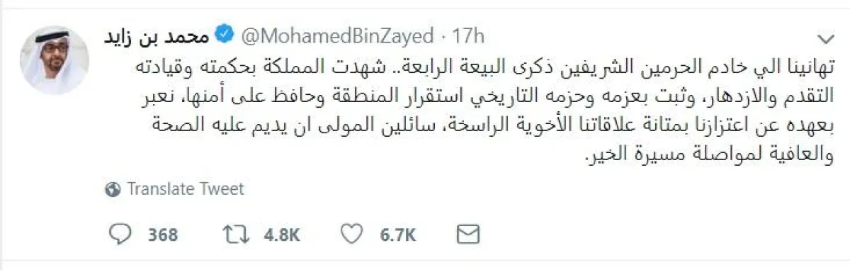 وقد استغل الأمراء والشيوخ والمشاهير والإعلاميون والشركات والمؤسسات وعامة الشعب منبر "تويتر" لتقديم أصدق عبارات التهاني والتبريكات إلى الملك المفدى، وتجديد البيعة له بهذه المناسبة، منهم الشيخ محمد بن زايد، ولي عهد أبو ظبي نائب القائد الأعلى للقوات المسلحة رئيس المجلس التنفيذي لإمارة أبو ظبي، الذي غرد قائلاً: "تهانينا للملك سلمان بذكرى البيعة الرابعة.. شهدت السعودية بحكمته وقيادته التقدم والازدهار، وثبَّت بعزمه وحزمه التاريخي الاستقرار في المنطقة، وحافظ على أمنها. نعتز في عهده بمتانة علاقاتنا الأخوية الراسخة، سائلين المولى أن يديم عليه الصحة والعافية لمواصلة مسيرة الخير".