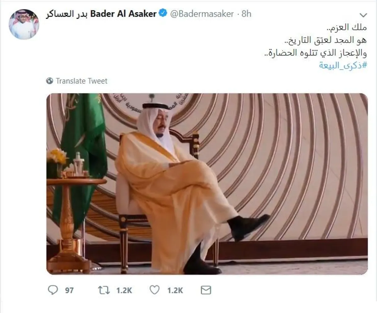 ونشر بدر العساكر، مدير المكتب الخاص بولي العهد، رئيس مركز "مبادرات مسك"، فيديو للملك سلمان، وعلَّق عليه: "ملك العزم.. هو المجد لعبَق التاريخ.. والإعجاز الذي تتلوه الحضارة".
