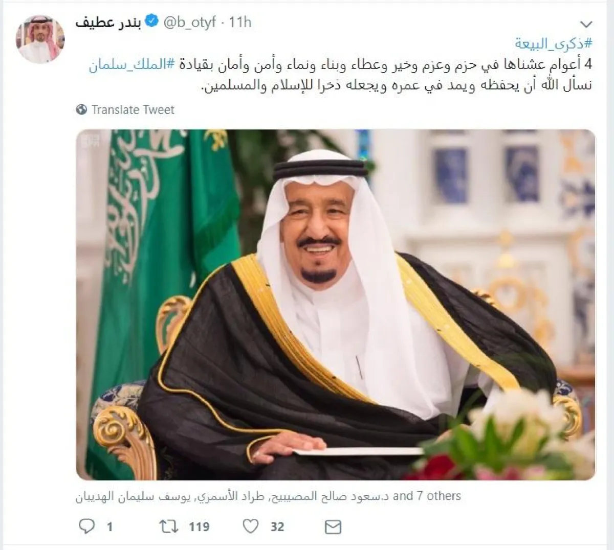 وقال الإعلامي بندر عطيف: "أربعة أعوام عشناها في حزم وعزم وخير وعطاء وبناء ونماء وأمن وأمان بقيادة الملك سلمان. نسأل الله أن يحفظه ويمد في عمره ويجعله ذخراً للإسلام والمسلمين".