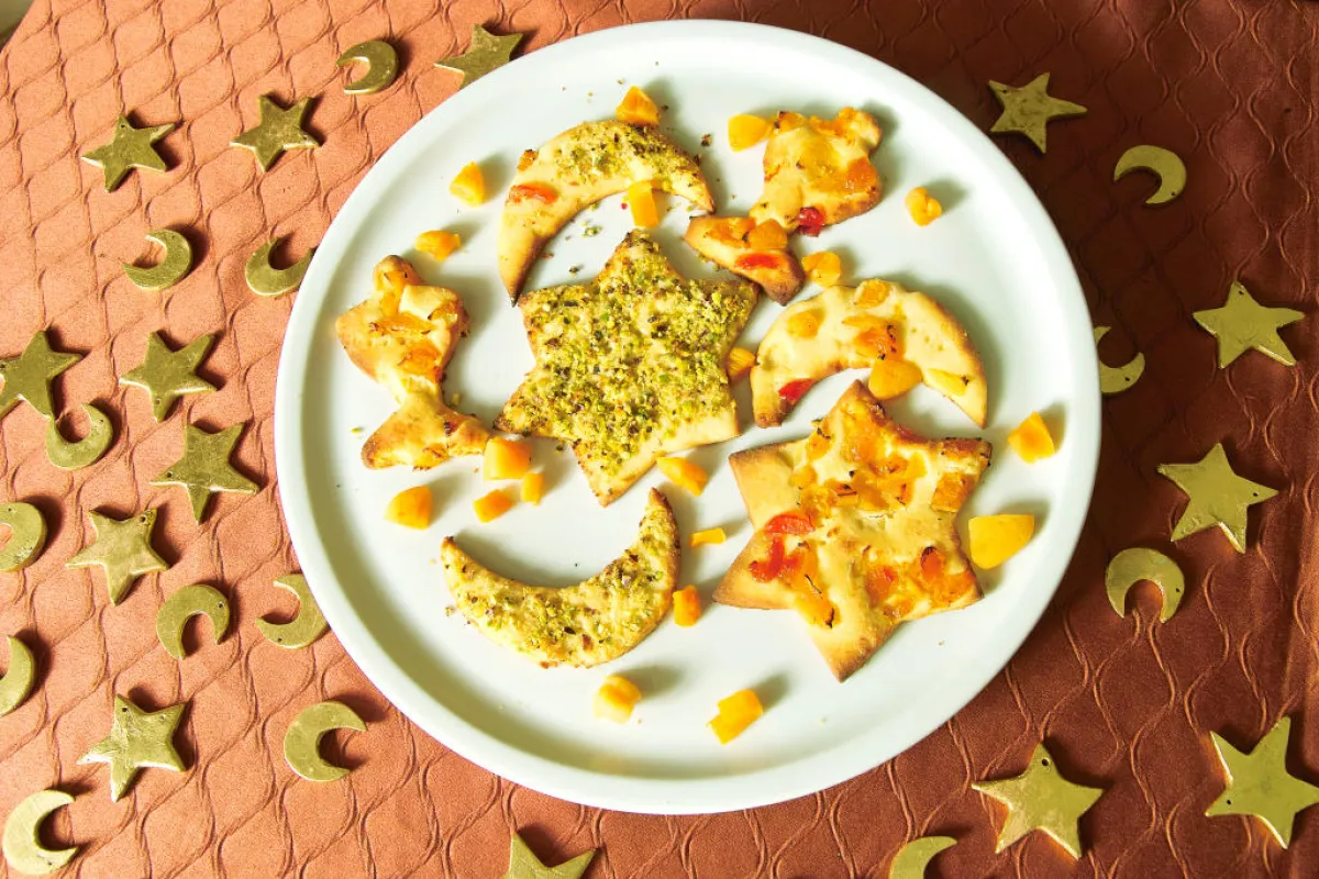 3 - يعجن كلّ من القسمين على حدة، وتفرد كل كرة عجين على مسطّح مغطّى بالدقيق الأبيض منعاً لالتصاقها، ثم تقطّع إلى أشكال محبّبة للأولاد كالنجمة والهلال.