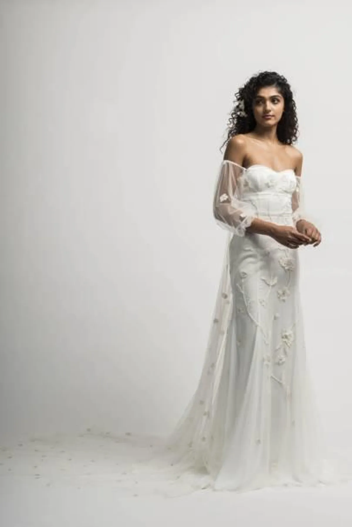 كما قدمت دار Alexandra Grecco تصميم بأكمام منفصلة، في فستان بقصّة الـStrapless مع قبّة القلب والمزين بـ الورود مع أكمام تول.