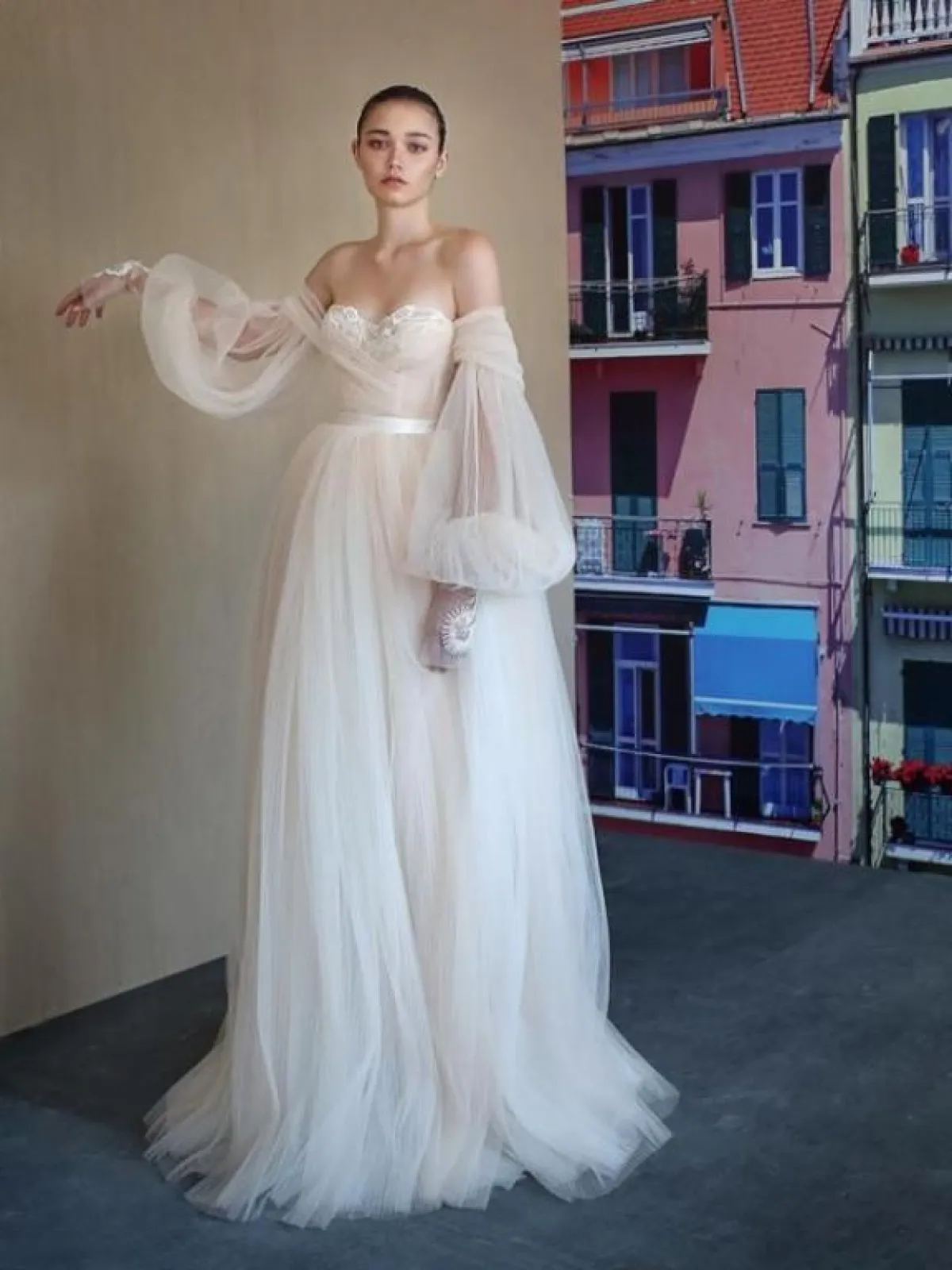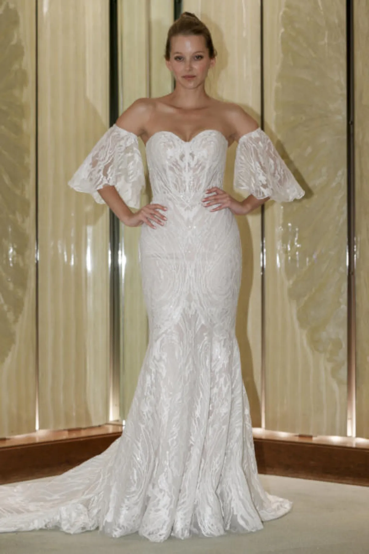 تعد دار انيس دي سانتو Ines di Santo من أشهر الماركات التي إهتمت بهذه الصيحة، وقدمتها في أكثر من تصميم بأكمام منفصلة سواء بتصميم منفوش أو بتصميم الجرس، مع فساتين زفاف Ball Gown، وقد ذكرتنا التصاميم بإطلالات الأميرات في القصص الخيالية.