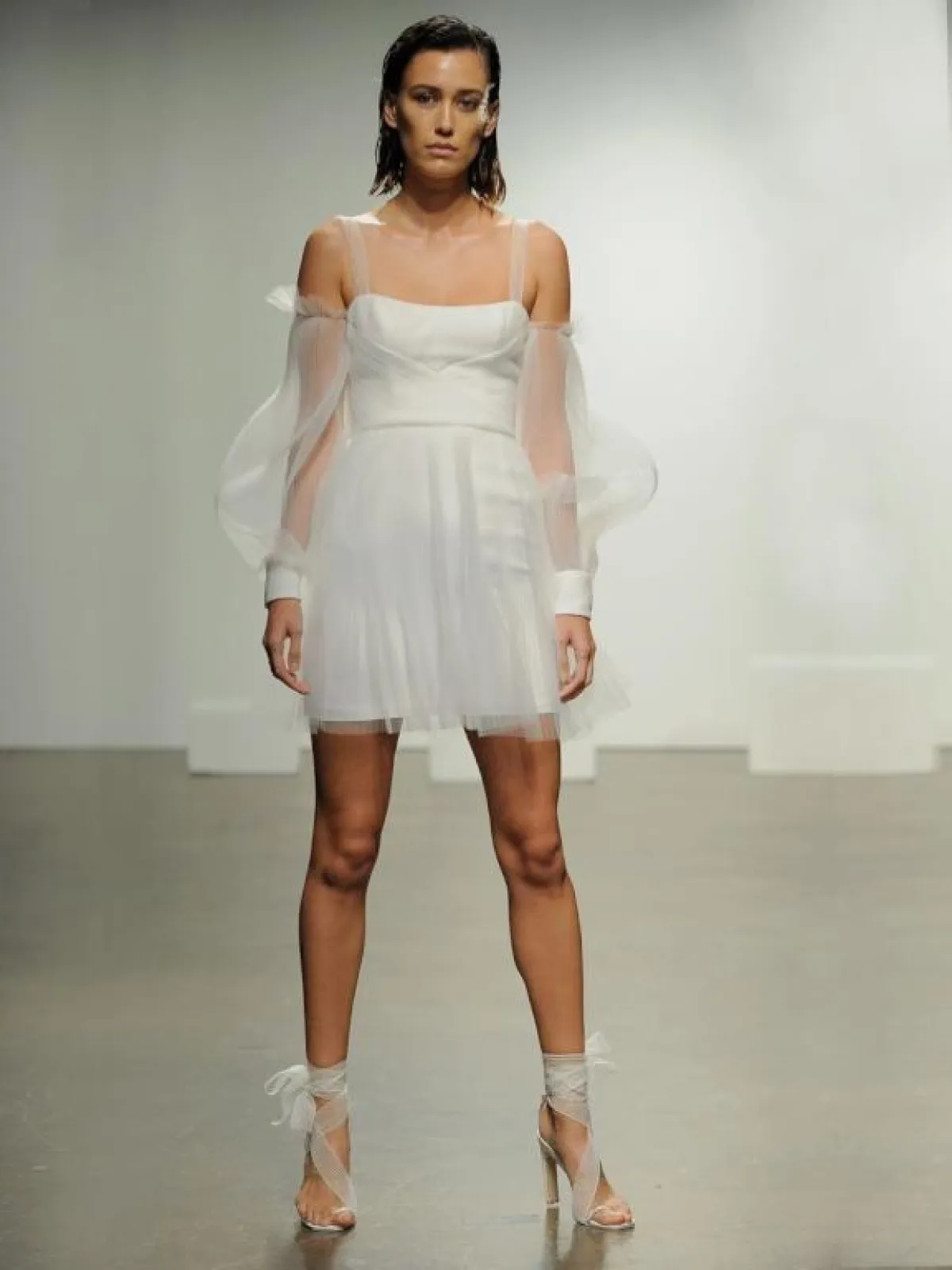وبرز هذا التصميم في عرض أثواب زفاف Rime Arodaky، وفستان قصير بتصميم بسيط وعصري مغطى بالتول مع أكمام طويلة وواسعة من التول.