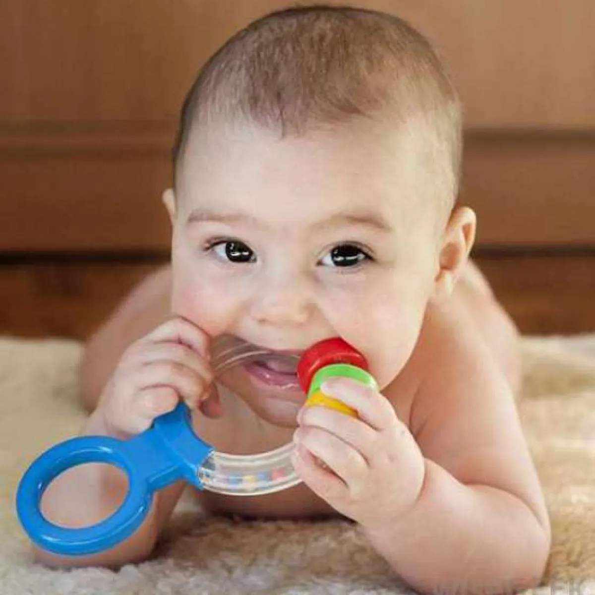 يقبض على الأشياء بين السبابة والإبهام بجانبهما وليس من طرفهما، كما يستطيع أن يحرك الشخشيخة