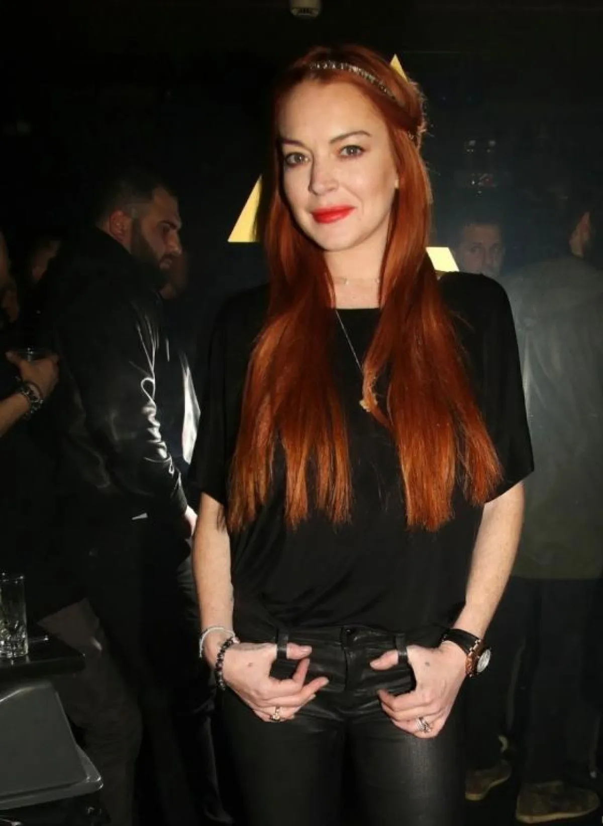 كما اعتمدت خلال إحدى السهرات الليلية على إطلالة تتسم بنفس درجة البساطة حتى لا تلفت إليها الأنظار ربما، باعتماد بنطلون جلد عالي الخصر، وتيشرت أسود فقط، وما كسر حدة اللون هو شعرها الأحمر الكستنائي.