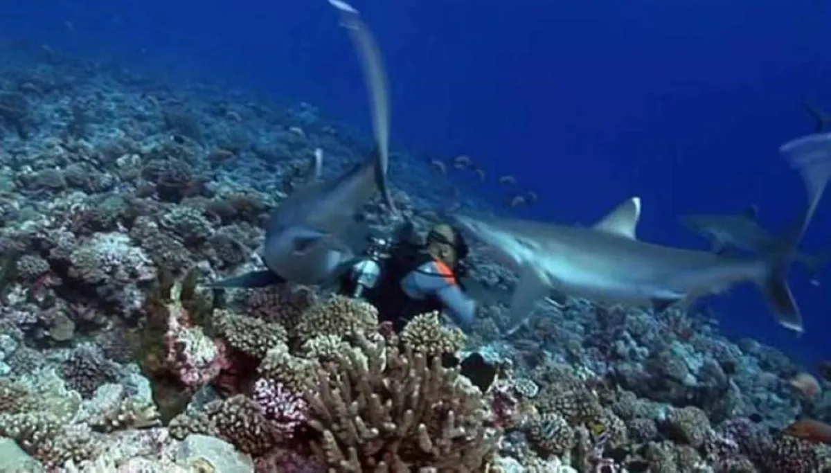 وكان الغطاس الألماني بيتر شنايدر يستمتع في أعماق المحيط ببولينيزيا الفرنسية، ليجد نفسه محاطاً بـ6 من أسماك القرش دفعة واحدة.