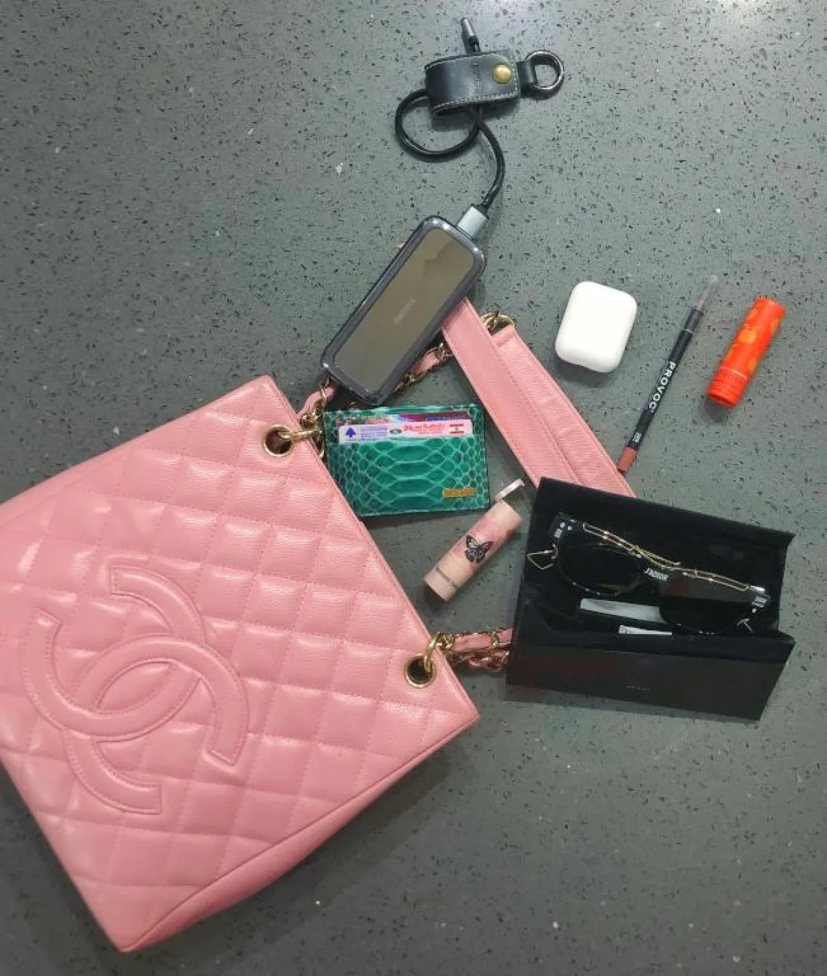 - المحفظة ، Airpods، أحمر الشفاه ، مرطب الشفاه، وشاحن البطارية.