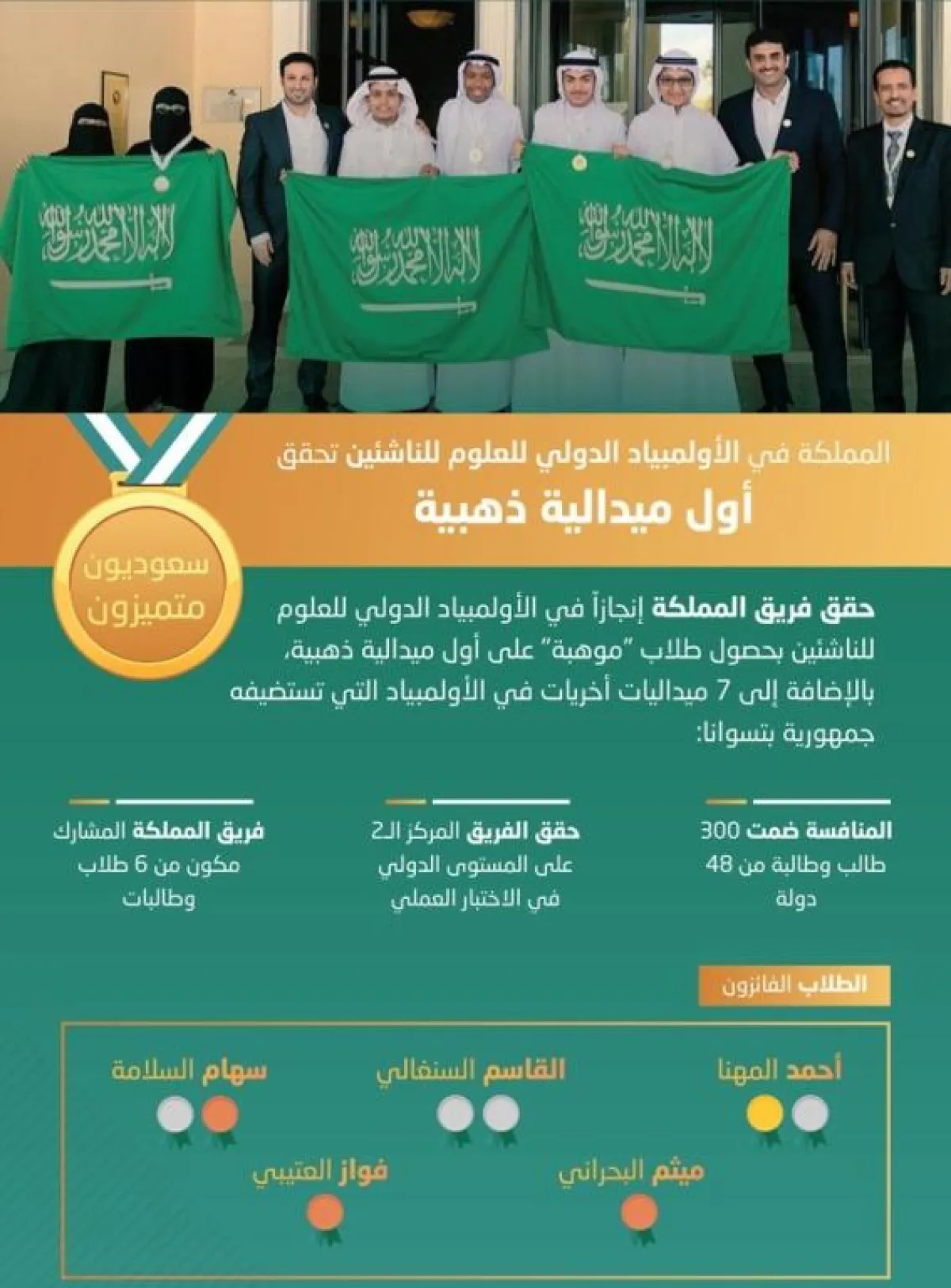 وحصد طلاب "موهبة" ثماني ميداليات في هذه المنافسة التي شارك فيها 300 طالب وطالبة من 48 دولة في جمهورية بتسوانا خلال الفترة من 2 إلى 12 ديسمبر الجاري، كما حقق الفريق السعودي المركز الثاني على المستوى الدولي في الاختبار العملي بفوز كلٍّ من: أحمد المهنا، وسهام السلامة، والقاسم السنغالي بثلاث ميداليات فضية إضافية ليكون مجموع الميداليات التي حققتها السعودية ثماني ميداليات.