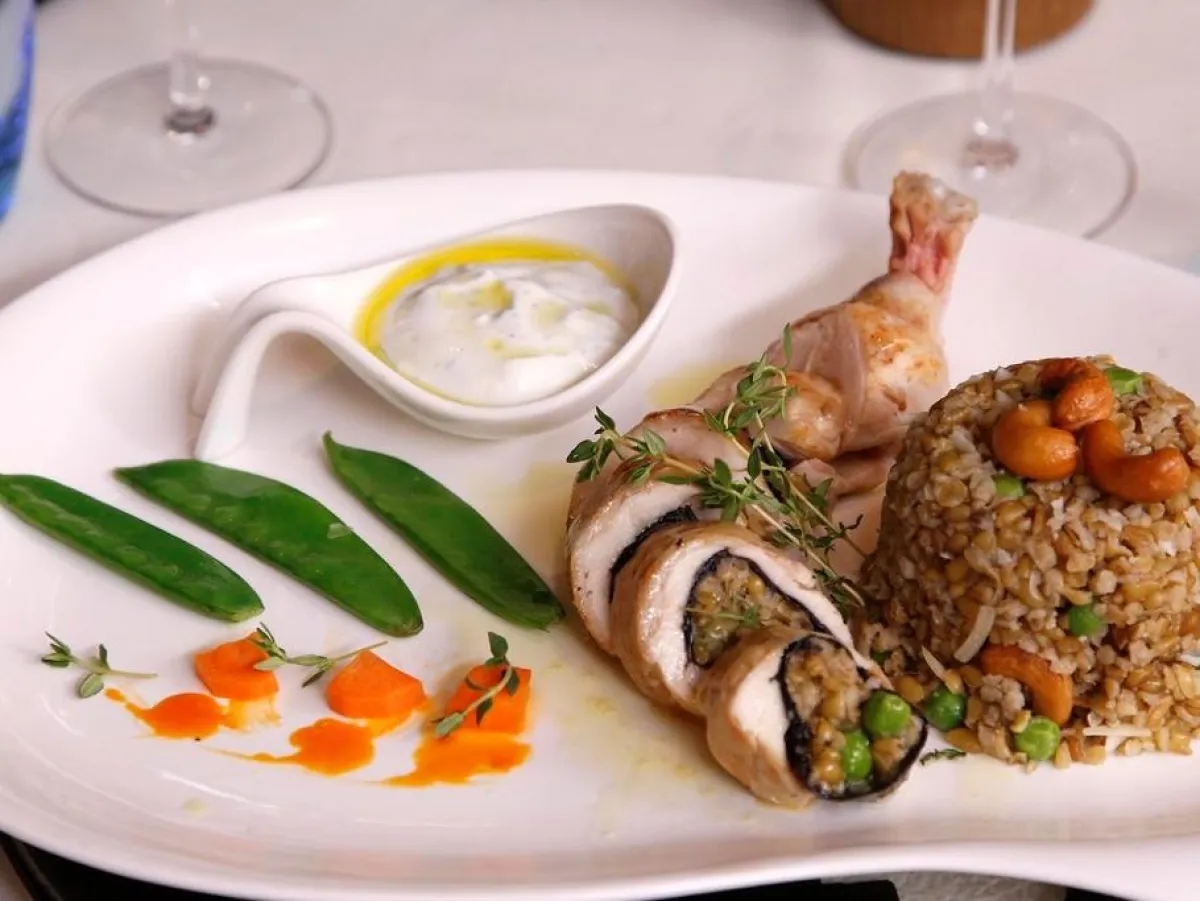 2- يحشى الدجاج بقليل من الفريك، ويلفّ على شكل أسطوانة، ويقدّم مع الفريك والخضراوات المسلوقة.