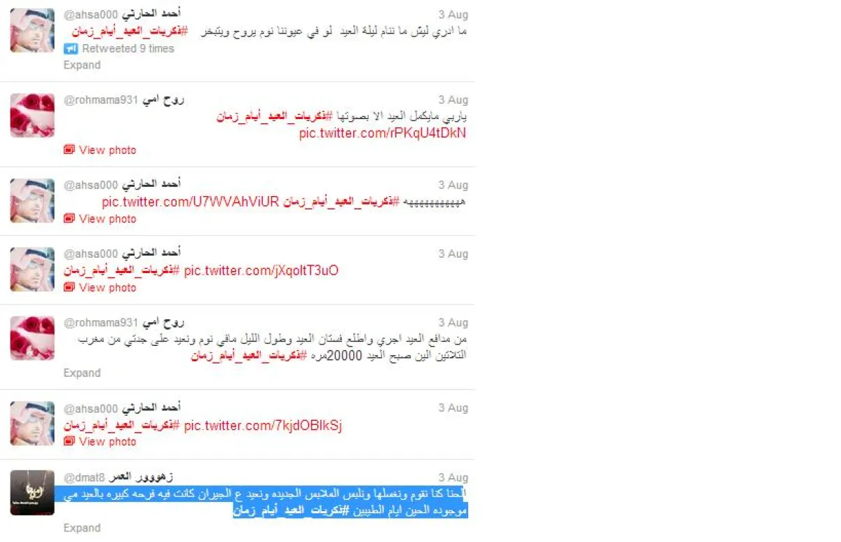 وكان لذكريان الماضي نصيبًا من تغريدات السعوديُّون في هاشتاغ ذكريات العيد أيام زمان، ومقارنتها بالحاضر الذي رأوه أقلّ بهجة، حيث كتب امل وطني @ : " ذكريات_العيد_أيام_زمان كنا بعد صلاة العيد بالشَّارع أنا وأخواتي والي يسلم من الرجال يعطينا عيديه أما الحين كويس إذا حدا يسال عنك ويعايدك"، وغرَّدت روح امي @: "من مدافع العيد اجري واطلع فستان العيد وطول الليل ما في نوم ونعيد على جدتي من مغرب التلاتين الين صبح العيد 20000 مره ذكريات_العيد_أيام_زمان"، وكتب حمد الحارثي @ : "ما ادري ليش ما ننام ليلة العيد لو في عيوننا نوم يروح ويتبخر"، وغرَّدت زهووور العمر @: "حنا كنا نقوم ونغسل ونلبس الملابس الجديدة ونعيد ع الجيران كانت فيه فرحه كبيره بالعيد مي موجودة الحين أيام الطيبين ذكريات_العيد_أيام_زمان ".