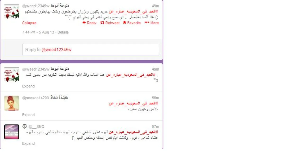 وصف المغرِّدون العيد في السعوديَّة كلّ منهم وفقًا لوجهة نظره بشكل لا يخلو من الطَّرافة، فقد كتبت : دلوعة أبوها @: "حريم يتقهون وبزران يطرطعون وبنات يهايطون بكشختهم :) هذا العيد باختصار .. اي صح وأمي تغمز لي يعني قهوي"، وكتبت فٍيٌـدّةٌ مٌحّمٌدْ @: " العيد_في_السعوديه_عباره_عن ﻻبس وعيون حمراء"، وغرَّد @ : العيد_في_السعوديه_عباره_عن قهوة فطور شاهي، نوم، قهوة غداء شاهي، نوم، قهوة عشاء شاهي، نوم، وثلاثة أيام نفس الحالة وخلص العيد :')"، وكتبت ahmad-alsinani @ :" @الشباب يصبون قهوة والبنات يحشون في بعض محد فالها غير البزران طراطيع وعيديه اااااه بس" ، وغرَّدت حلا العجمان @ : "نمت ما نمتي، أحسن مني نمتي ساعة، ما ع رفت أنام ، ما نمت أبدا، وسرا الليل وحنى ما سرينا"، وكتب Suliman @ : "كرف وتعب وجهد وتكلف بعدما كان فرحه وصلة رحم وسدا لحاجة المحتاج والفقير والمسكين"، أما كدش ناعم @ فغرَّدت ساخرة : "والله ما تصبين خلي رهف تصب، والله ما توزعين قومي يا رهف وزعي، والله ما تشيلين قومي يا رهف شيلي!"، وكتب يب متعافي♔ @:" العيد_في_السعوديه_عباره_عن ناس مواصلة وانتقاد ملابس !!"، وكتب من أسمى نفسه | ½ مواطن مؤدب @ : لعيد_في_السعوديه_عباره_عن ليلة يتيمة لا أول لها ولا آخر ناس نايمين ناس لابسين ناس مو لاقين ناس ميتين وناس يفكروا إنهم فرحانين وفيه المهيصين"، ولخَّصت متجردة | 330: @ العيد من وجهة نظرها كاتبة: "ناس مو طايقين بعض متجمعين يجاملون بعض".