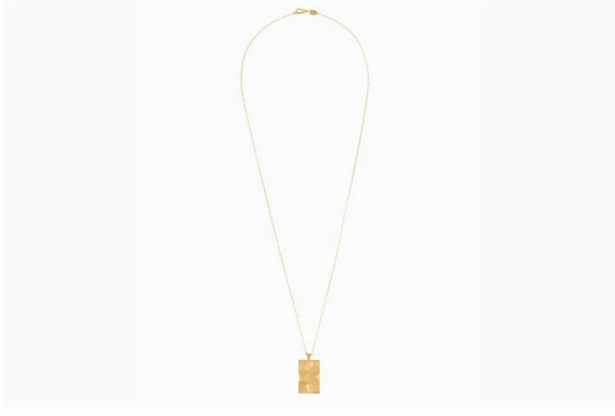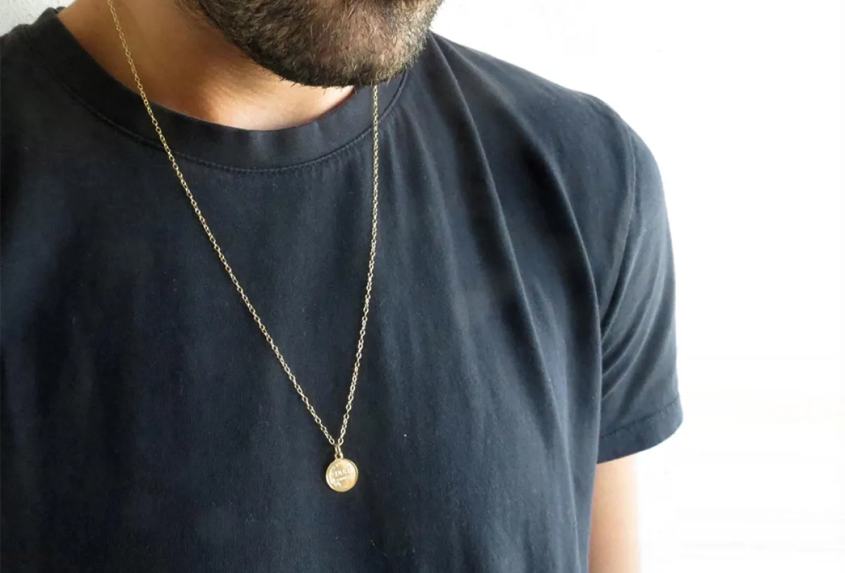أما إن كنت تتمتع بالبساطة والهدوء فسيعجبك هذا التصميم من A.P.C. مع القلادة البسيطة التي يمكن أن تكتب عليها أول حروف من اسمك أو اسم من تحب حسب رغبتك.