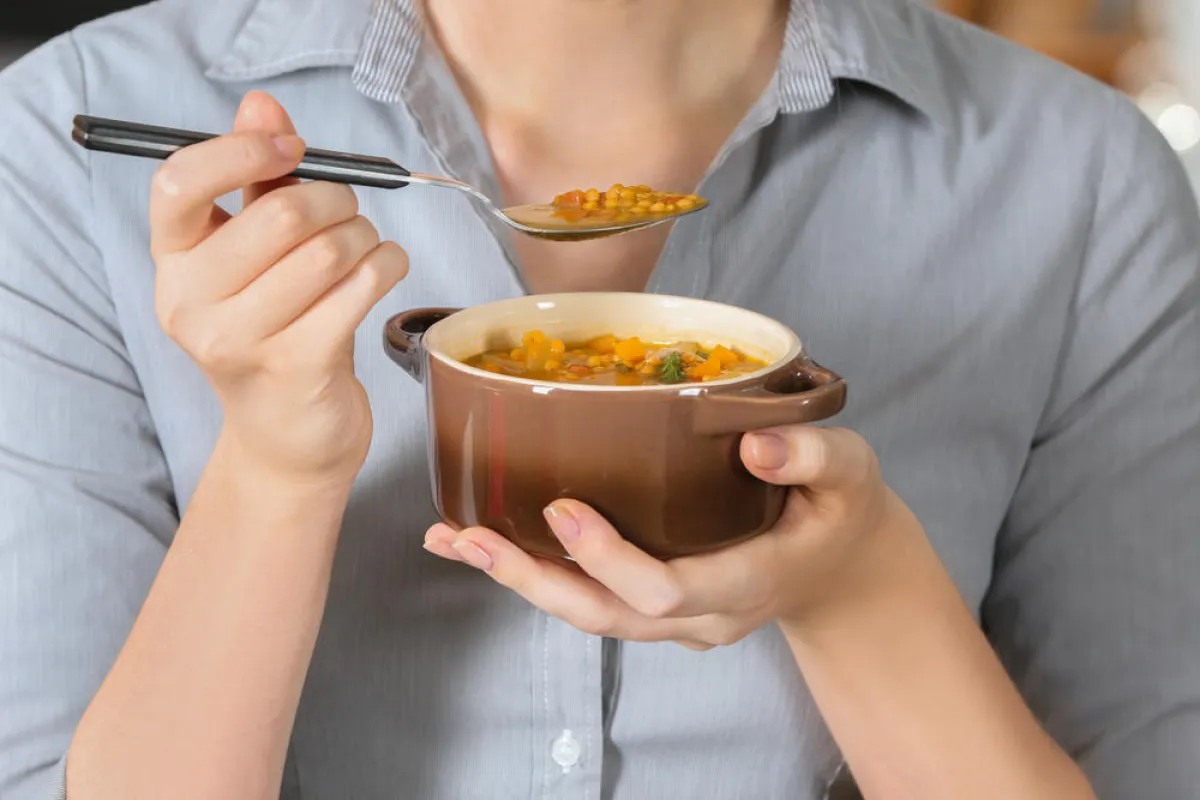 • العشاء: كوب من شوربة العدس + 150 غرامًا من البروتين المشوي.
