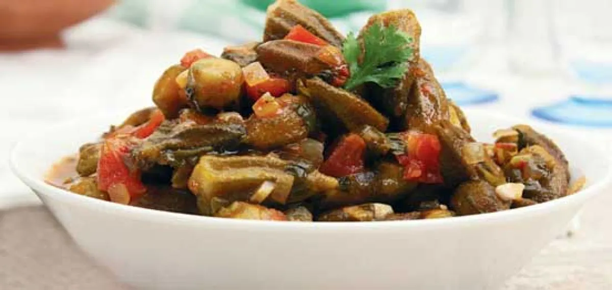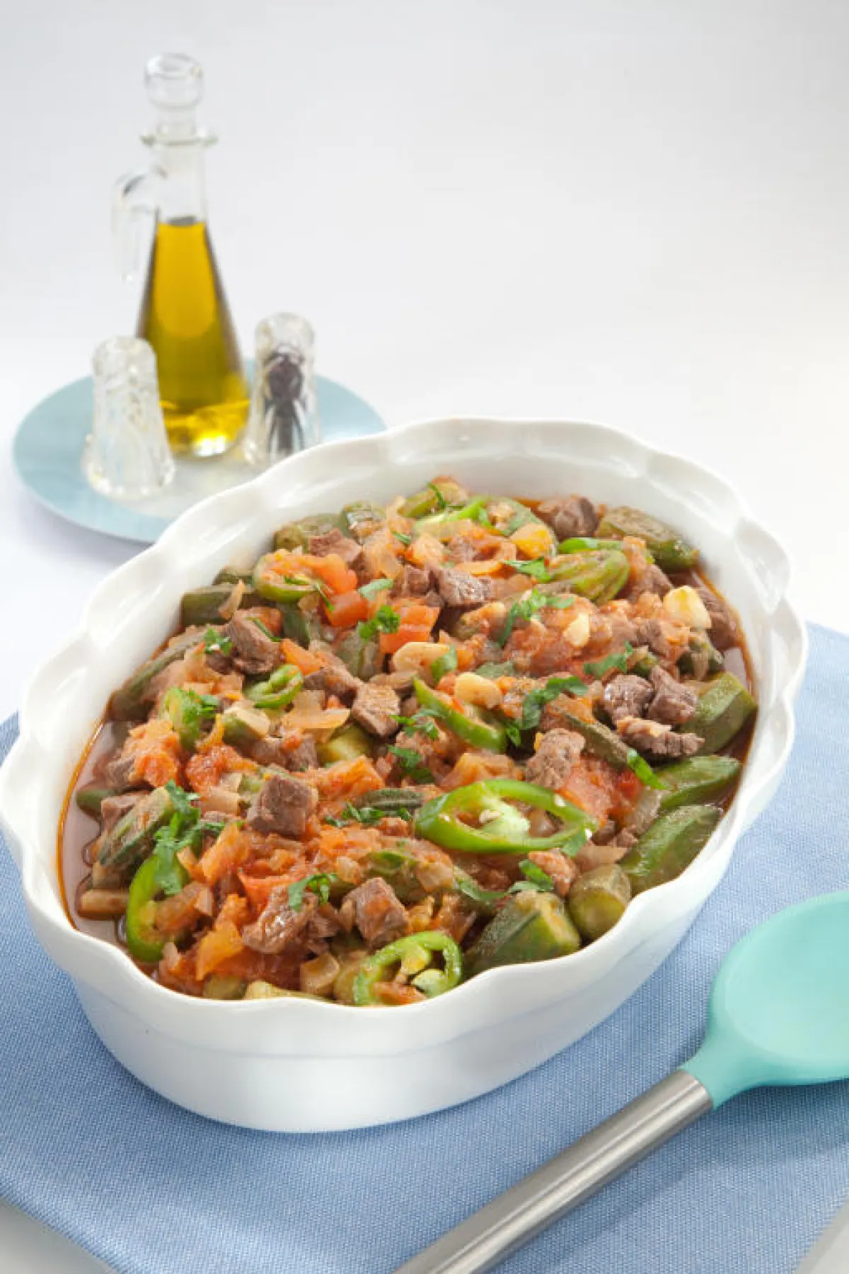 4-أضيفي البامية، وقلّبي إلى أن تتحمّر.ضعيها في طبق الفرن، ثم وزعي فوقها الطماطم. وذوبي المعجون في المرق أو الماء، ثم أضيفيه للبامية.