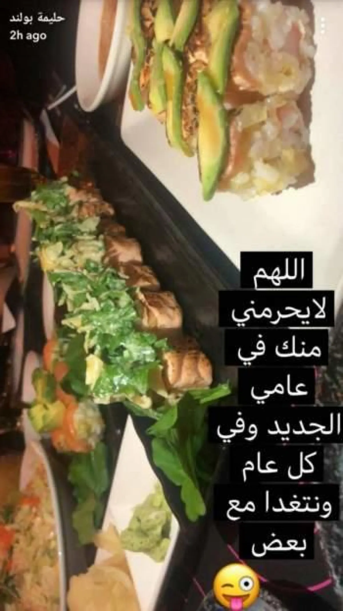 حليمة بولند التي إستعرضت قبل يومين، حفل عيد ميلادها الأوّل مع أهلها وإبنتيها، نشرت عبر حسابها على "سناب شات" صورتين الأولى وهي تتناول السوشي المزين بالذهب، والثاني وهي تتناول الطعام مع زوجها إحتفالاً بعيد ميلادها مع تعليق تمنت خلاله ألا يفترقا أبداً.