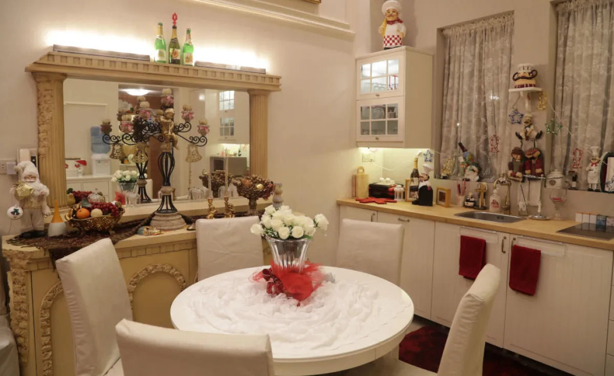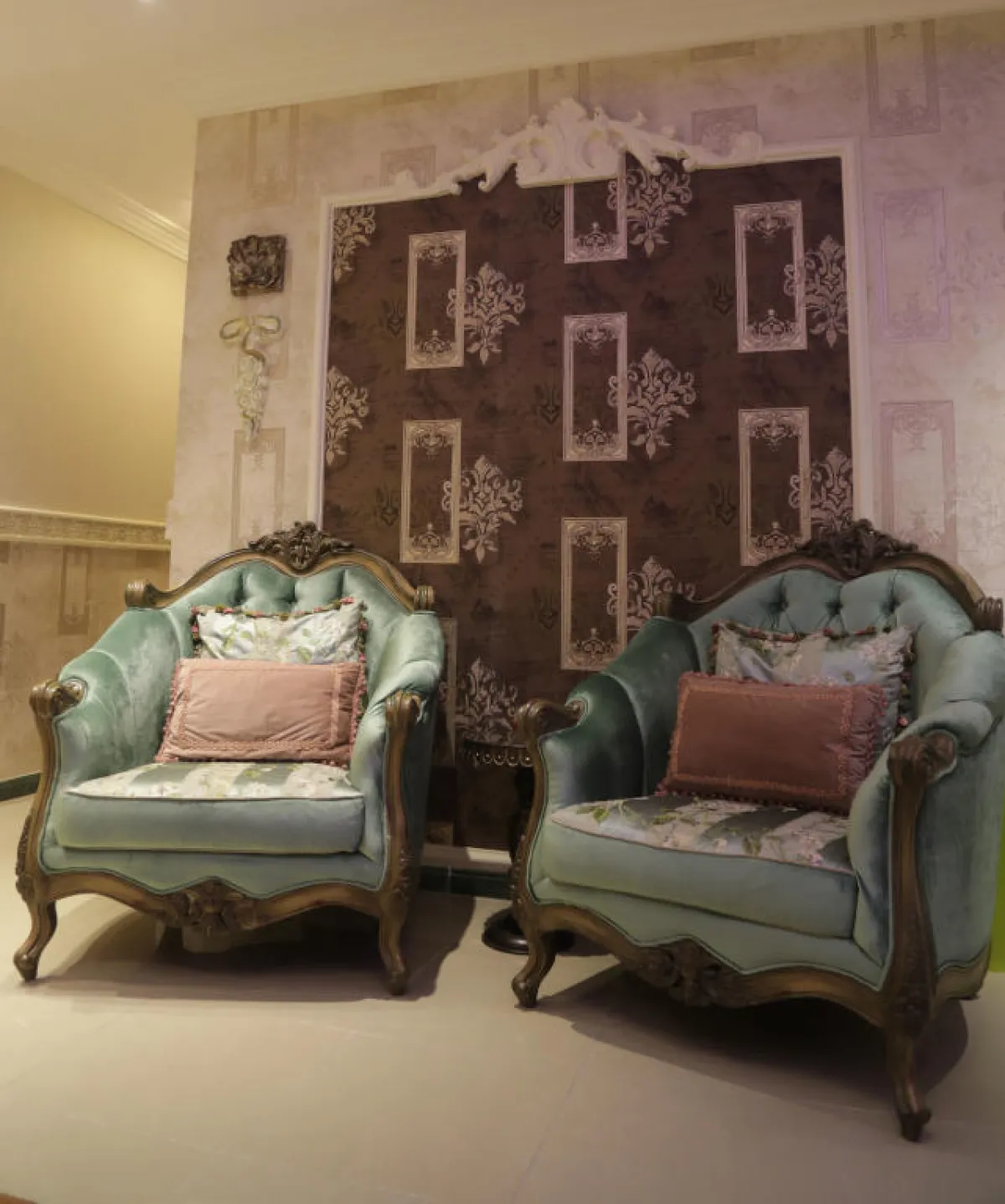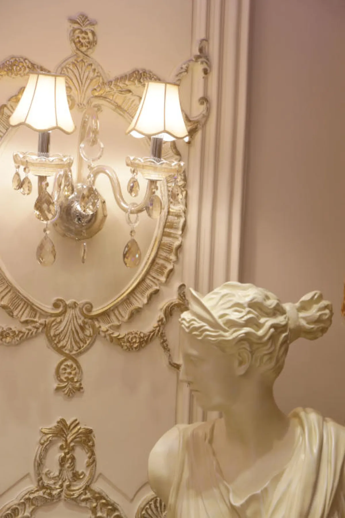 • الشمعدانات الجدارية: تستخدم المصمِّمة الشمعدانات والإضاءات الجدارية المصنوعة من الـ"فايبر" والحديد المطروق، مع لمسة من الطلاء الذهبي الذي يوحي بالفخامة.