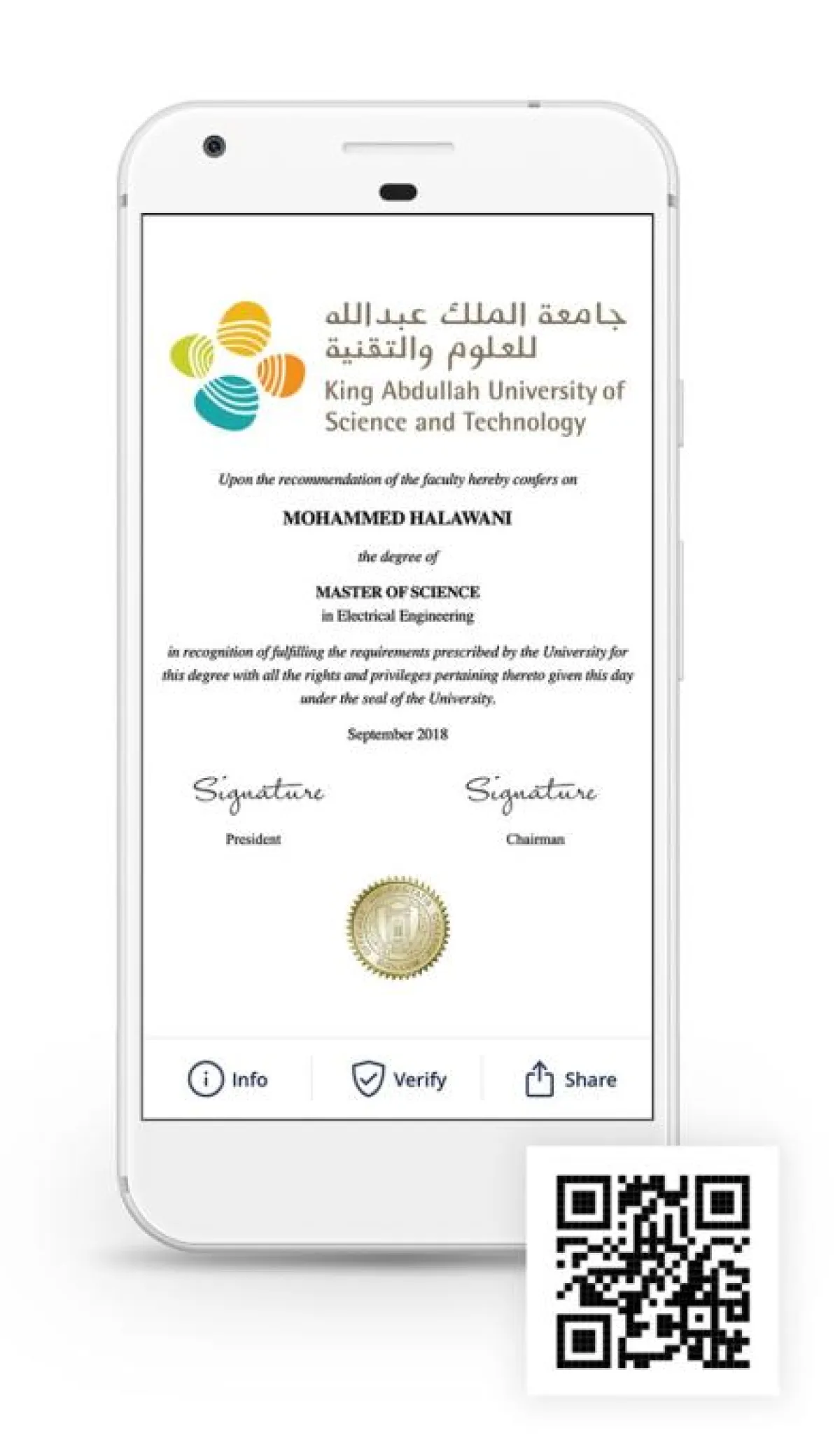 وستصدر كاوست شهاداتها الرقمية لأول مرة لجميع خريجي عام ٢٠١٨، مستخدمة نظام شركة ليرنيغ ماشين تيكنولوجيز. وستعتمد الشهادات الصادرة على مبدأ بلوك سيرتس القائم على تقنية بلوك تشين، الذي يعد معياراً عالمياً مفتوحاً للسجلات الرقمية المعتمدة المحمولة والآمنة، والتي يمكن التحقق منها مدى الحياة دون أية تكلفة. ويتم إدارة بلوك سيرتس، التي طورتها ليرنيغ ماشين بالاشتراك مع مختبر الوسائط المتعددة في معهد ماساتشوستس للتكنولوجيا، من قبل مجتمع عالمي من المساهمين.