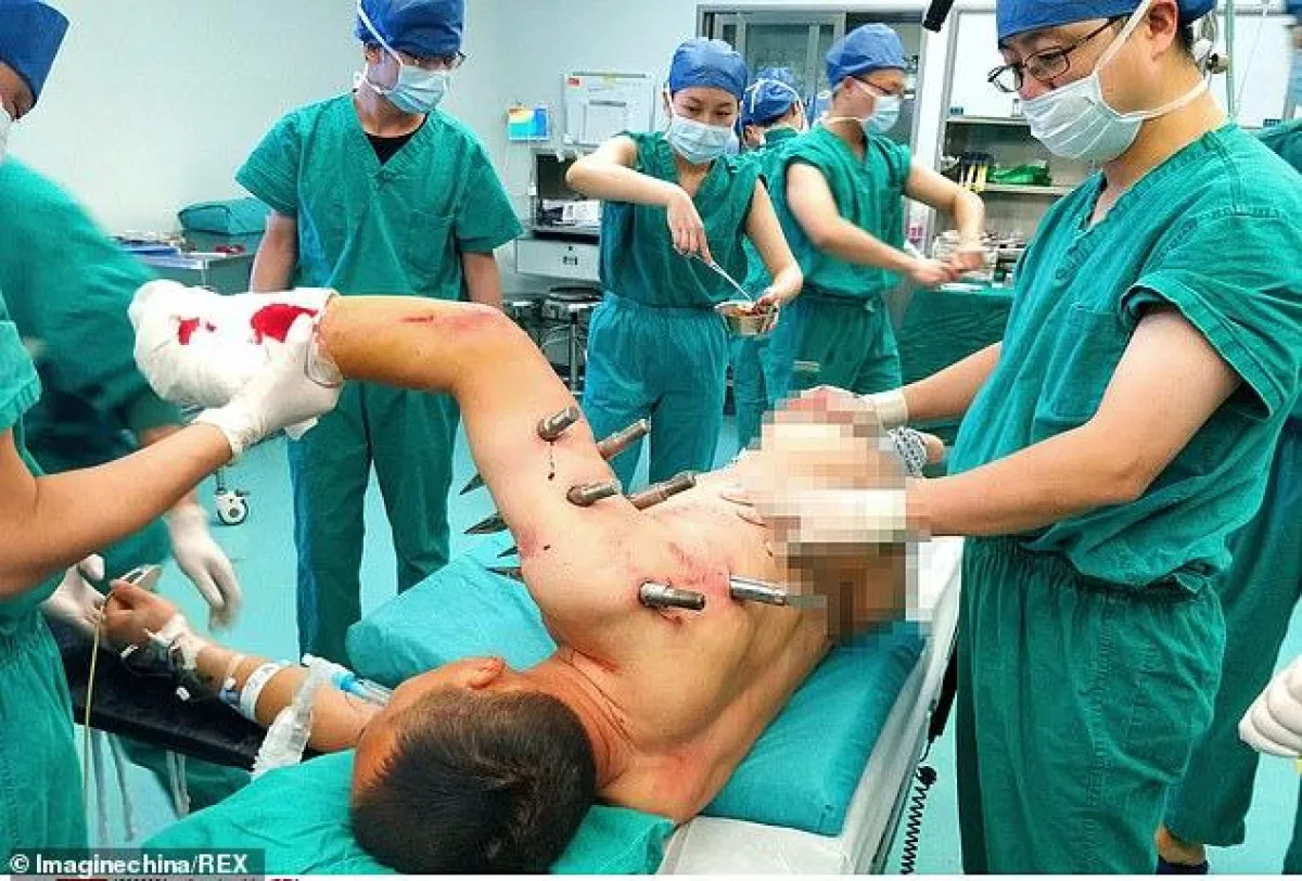 ووفقا لصحيفة "ديلي ميل" البريطانية، فإن "تشو"، 49 عامًا صدم الأطباء عندما تم نقله إلى المستشفى ومغروس بداخله 10 قضبان معدنية كبيرة مدببة في صدره وذراعه، إثر تعرضه لحادث مروع في مصنع.