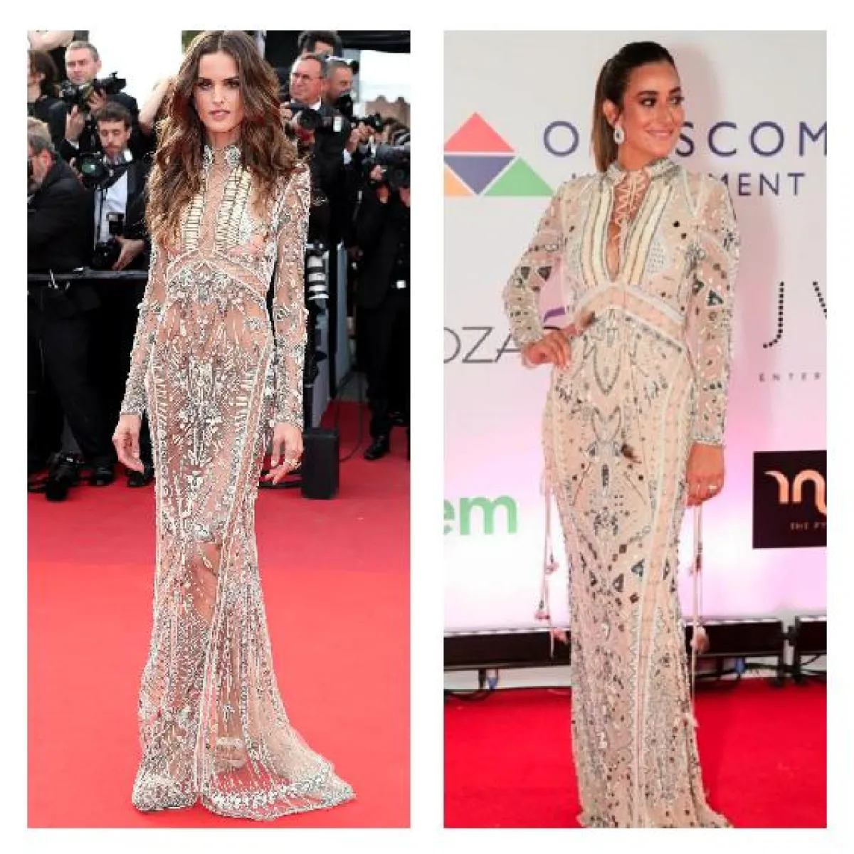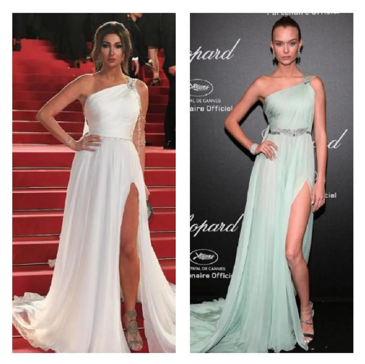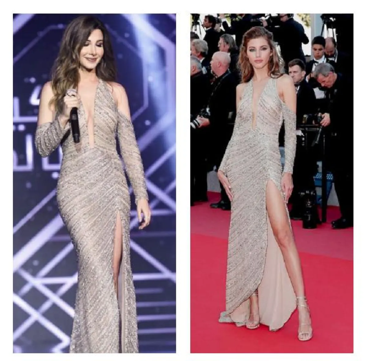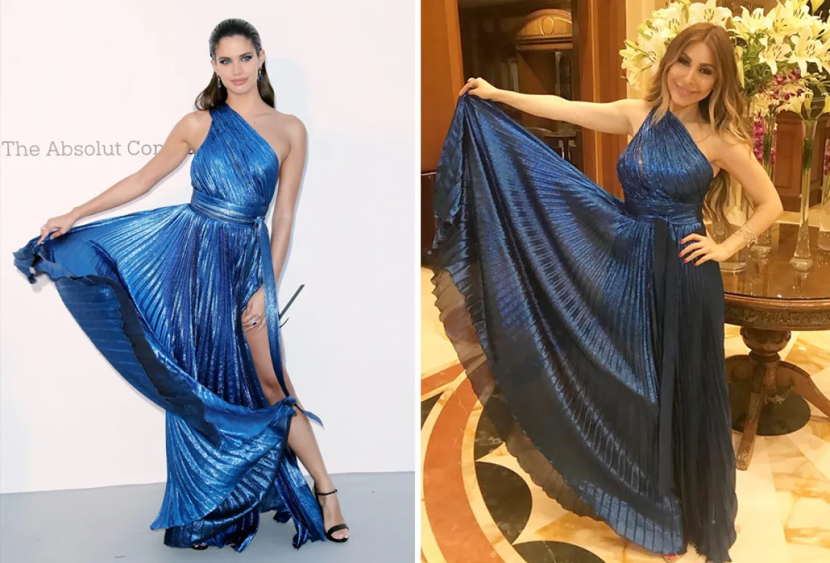 شاهدنا نانسي عجرم بداية هذا العام في فستان براق باللون الفضي مع أكتاف مكشوفة من “جورج حبيقة” Georges Hobeika وكذلك شاهدنا عارضة الأزياء “فاليري كوفمان” Valery Kaufman في الفستان نفسه على سجادة مهرجان كان في الربيع الماضي.