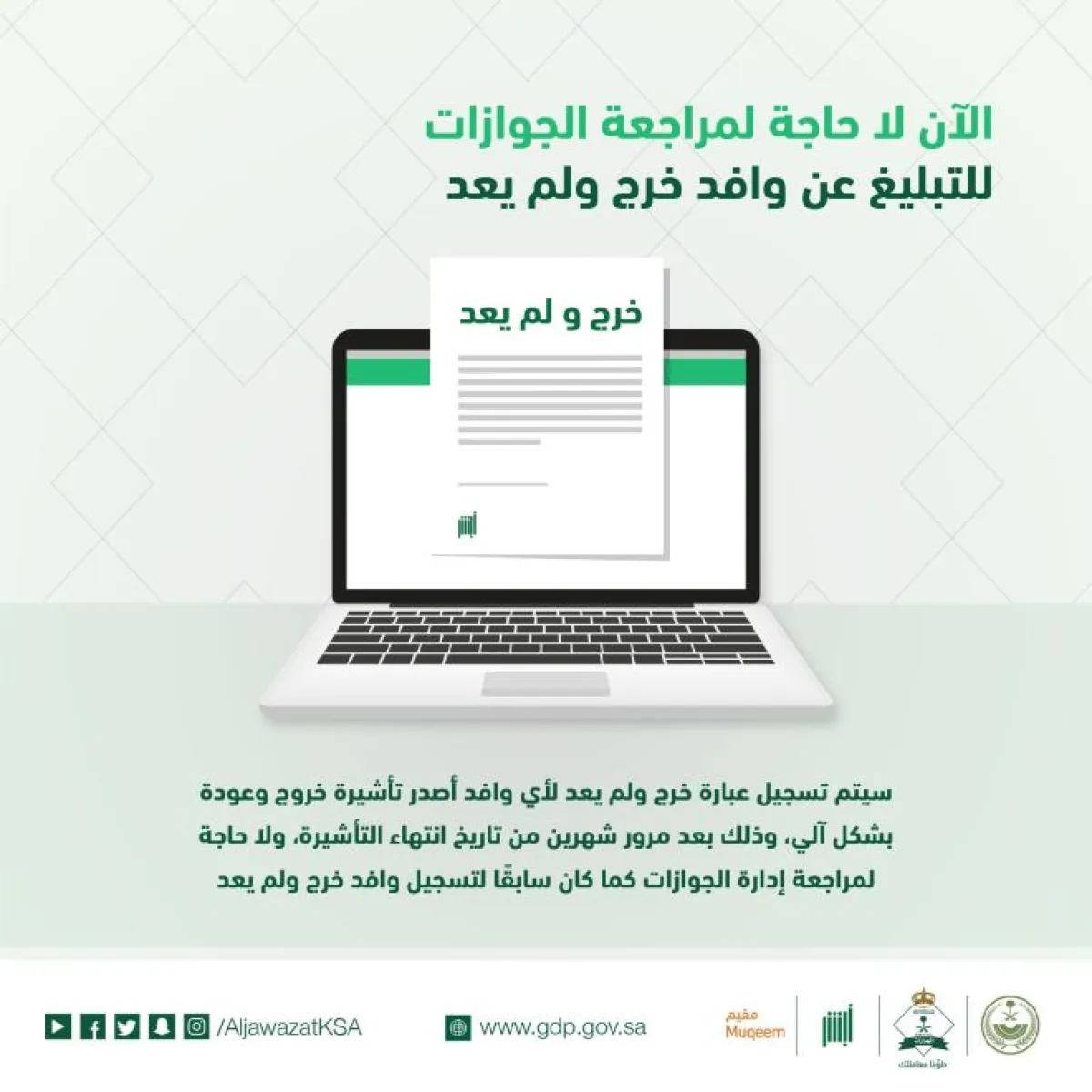 أعلنت المديرية العامة للجوازات السعودية عبر حسابها بتويتر، بأنه أصبح الآن تسجيل “خرج ولم يعد” آليًا، وذلك بعد مرور شهرين من تاريخ إنتهاء تأشيرة الخروج والعودة للوافد دون الحاجة لمراجعة إدارات الجوازات.