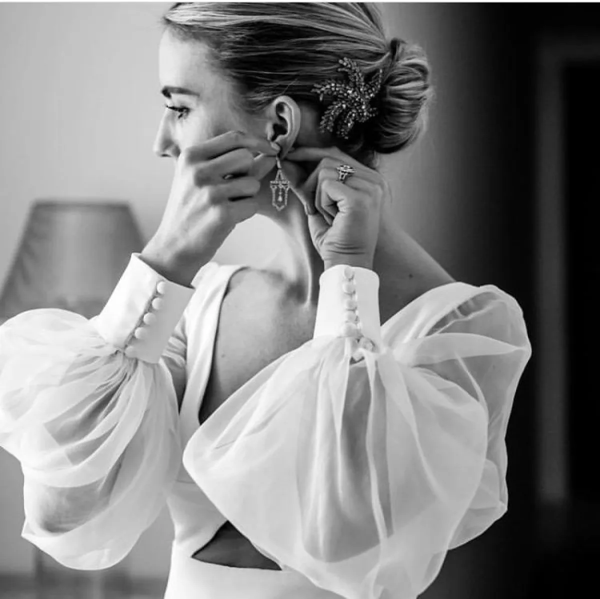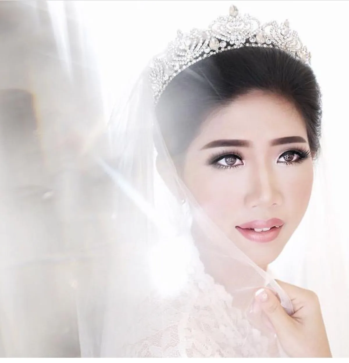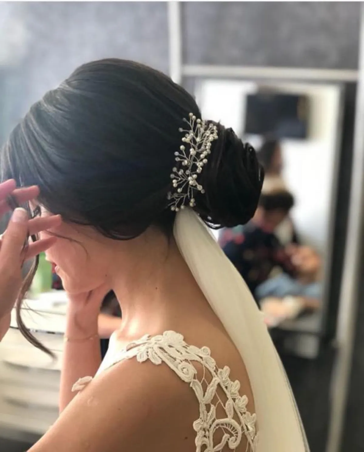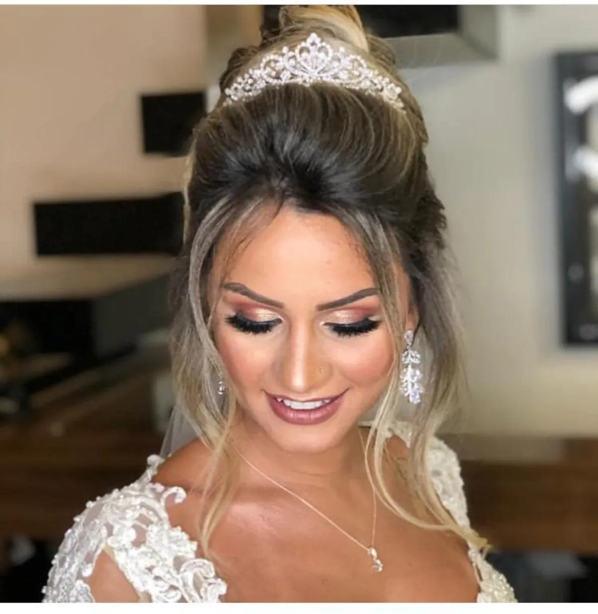 كذلك لفتتنا تسريحات شعر الـ wet look المرفوع للوارء لشعر أملس مهندم بالكامل، معه سوف تعتمدين على التاج الذي تختارينه حسب ذوقك، والطرحة المرفوعة.