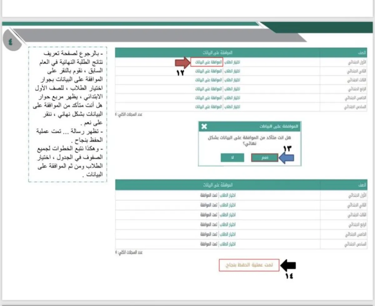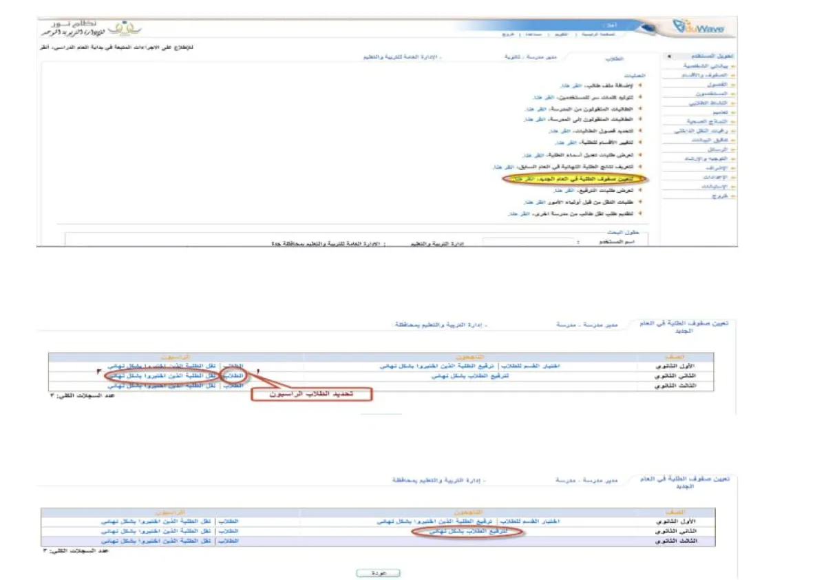 من خانة الطلاب، ثم رابط تعيين صفوف الطلاب، نقوم بالنقر على الرابط «تفعيل ترفيع الطالب من العام الحالي إلى العام القادم»، وهذا هو الرابط الجديد الذي يقوم بأمر الترفيع في النظام للمدرسة. ويتم تفعيل جميع روابط الترفيع بمجرد النقر على الرابط، وبذلك نبدأ ترفيع الطلاب، ثم نقوم بتثبيت الراسبين بالموافقة على رسالة التأكيد.