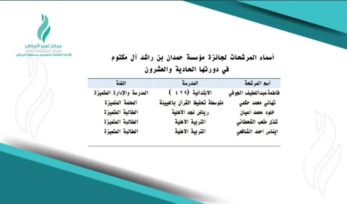 تحرص المملكة على النهوض بالتعليم، وإيصاله إلى مستويات عالية من التميز والتقدم، لينافس بقية الدول، وليحجز لأبنائه وبناته مكانة مميزة يشار إليها بالبنان. وتعد جائزة حمدان بن راشد للأداء التعليمي المتميز من الجوائز التي توليها إدارة التعليم بالمملكة اهتمامًا خاصًا، وتسعى للمشاركة فيها، ومؤخرًا قام مدير عام التعليم في منطقة الرياض "حمد الوهيبي" باعتماد أسماء المرشحين والمرشحات لهذه الجائزة في دورتها الحادية والعشرين، متمنيًا لهم التوفيق والسداد.