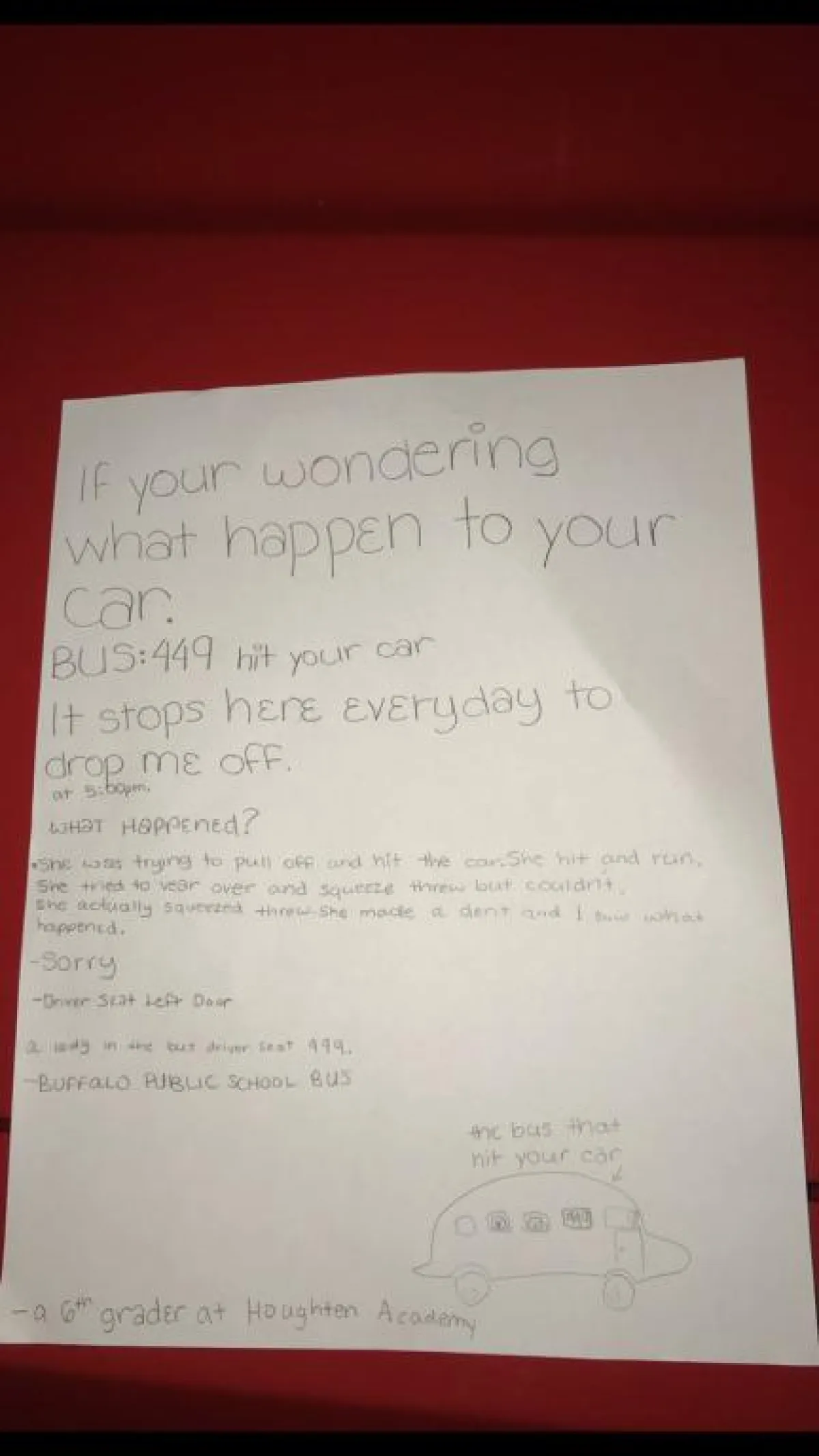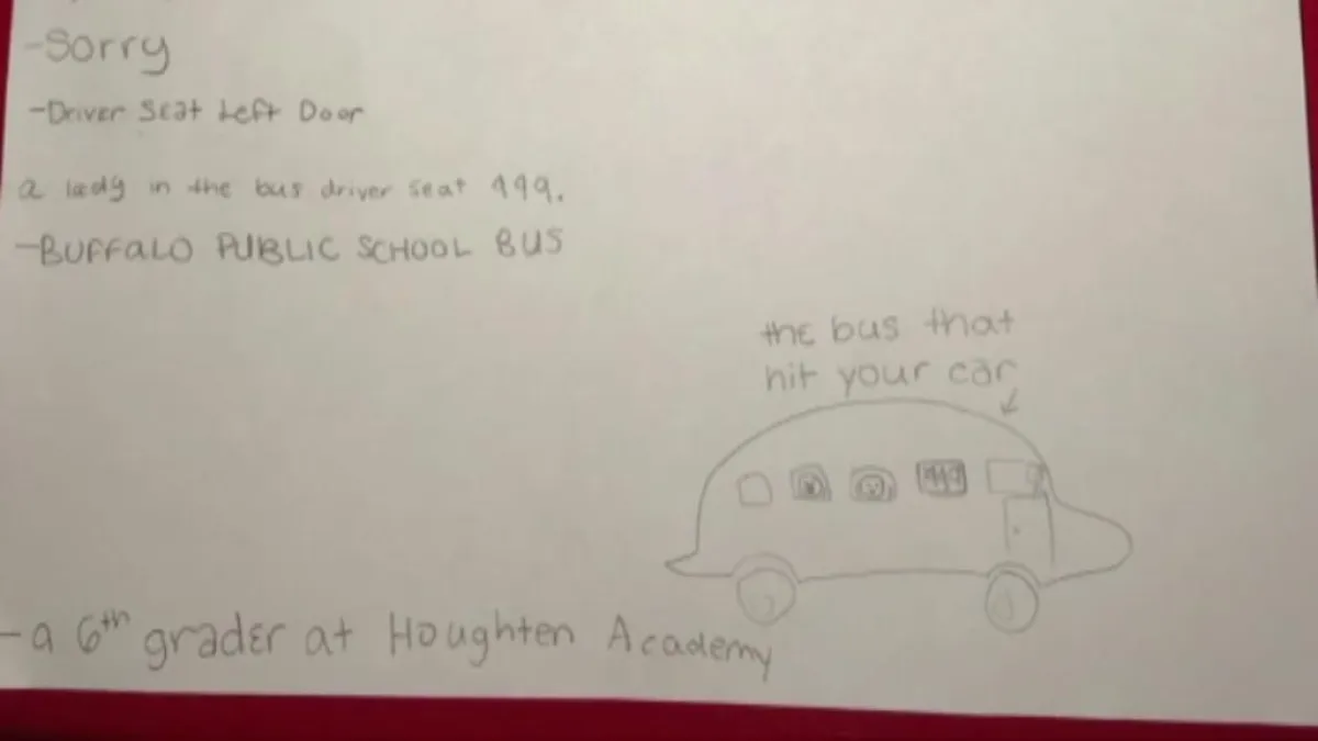 وعرّفت «زيارا» عن نفسها وعنوانها كاتبة: «مدرسة بافالو الحكومية»، ورسمت رسمة توضيحية بسيطة، لكيفية ضرب الحافلة لسيارة «سيبويز»، وختمت رسالتها بـ: «طالبة في الصف السادس في أكاديمية هوتون».