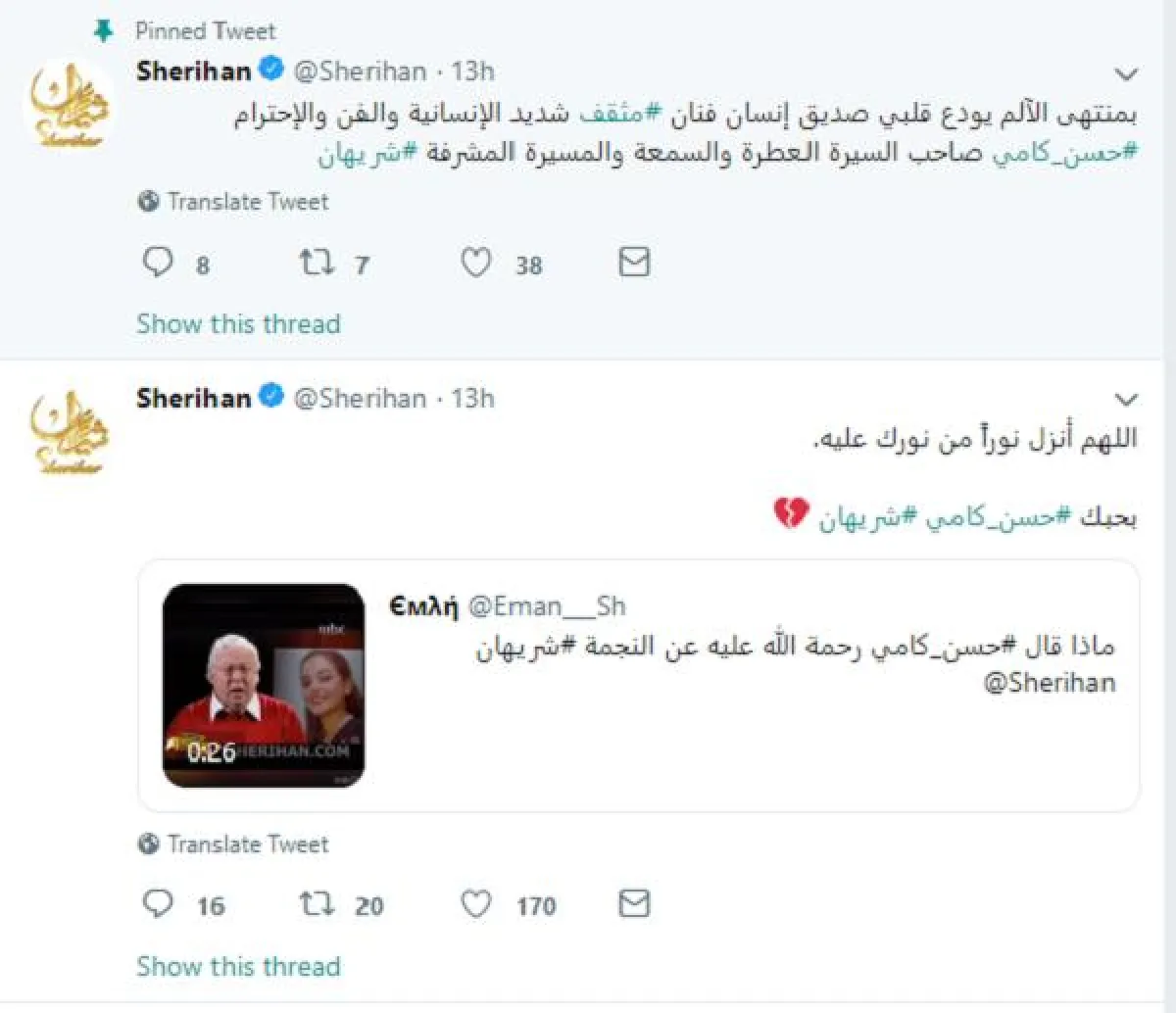 وبعدها أطلقت تغريدة حزينة قالت فيها: بمنتهى الآلم يودع قلبي صديق إنسان فنان #مثقف شديد الإنسانية والفن والإحترام #حسن_كامي صاحب السيرة العطرة والسمعة والمسيرة المشرفة.