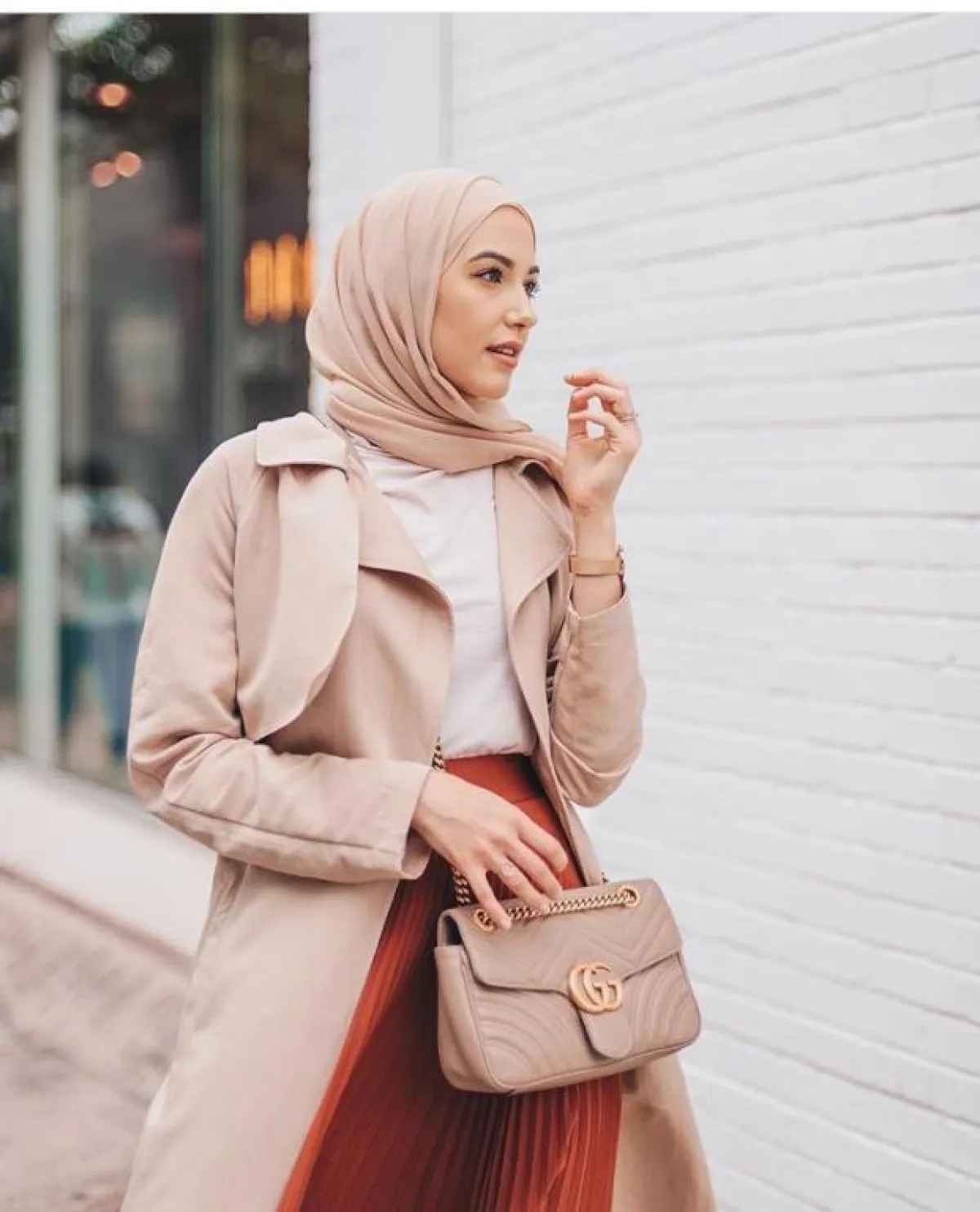 لفتنا هذا اللون الأخضر الساطع الذي اعتمدته مدونة الموضة الخليجية مرمر محمد من المعطف الترينش Trench Coat، مع حزام الخصر المحكم، واختارت الحجاب التقليدي باللون الأبيض، مع نظارة دائرية باللون العسلي لتكتمل الاطلالة الكاجوال.