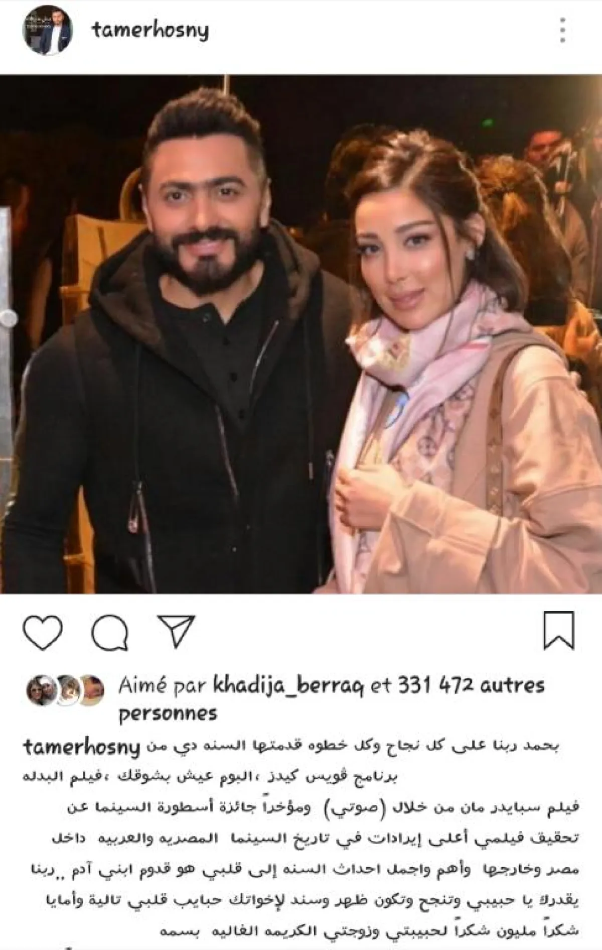 وبعد انتهاء العرض، تقاسم حسني مع متابعيه على "انستقرام"، صورة له مع زوجته بسمة بوسيل، أرفقها بتدوينة جاء فيها: "أهم وأجمل أحداث السنة إلى قلبي هو قدوم ابني آدم.. ربنا يقدّرك يا حبيبي وتنجح، وتكون ظهر وسند لإخواتك، حبايب قلبي تالية وأمايا.. شكرًا لحبيبتي وزوجتي الكريمة الغالية بسمة.. حلمنا بيكبر وبيتحقق".
