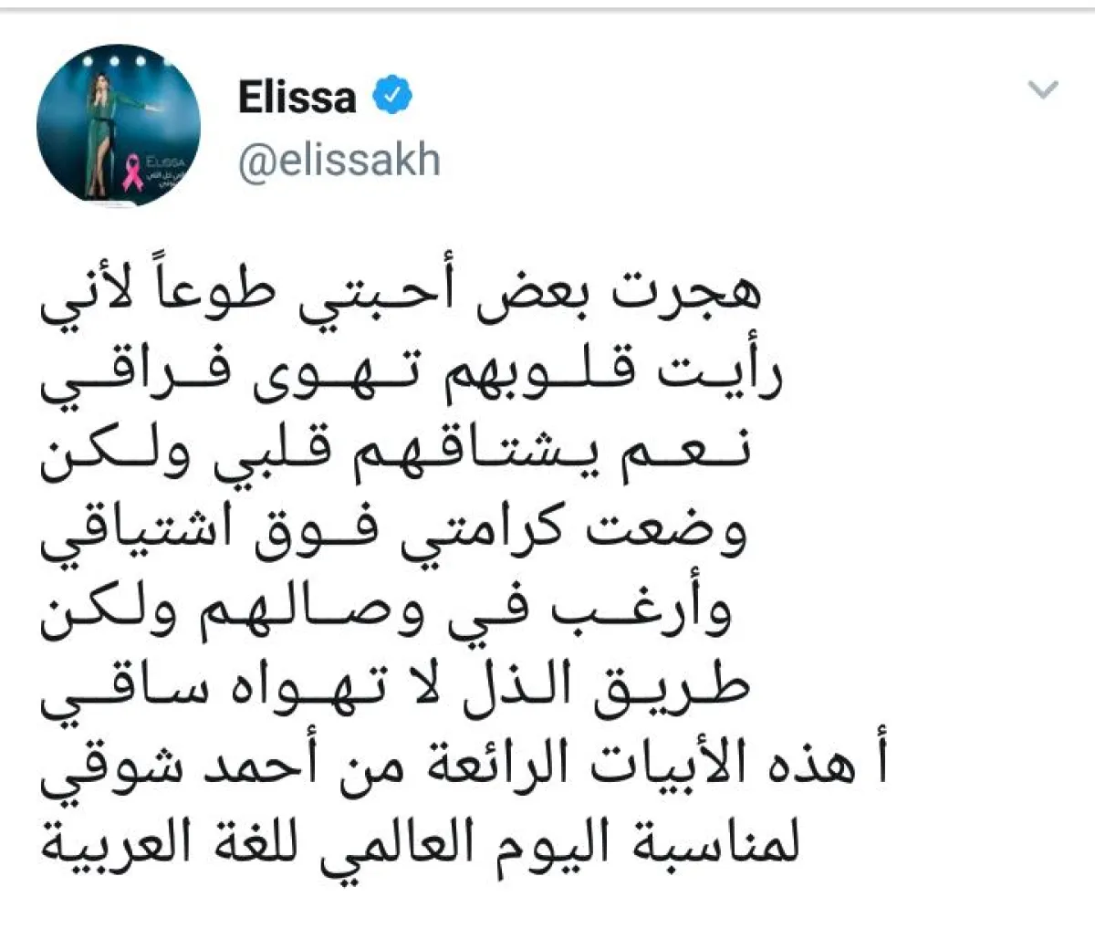 واختارت إليسا لهذه المناسبة، الاستعانة بأبيات لأحمد شوقي عند كتابة تغريدتها على "تويتر"، والتي جاء فيها: "هجرت بعض أحبتي طوعًا لأني رأيت قلوبهم تهوى فراقي.. نعم يشتاقهم قلبي ولكنّ كرامتي فوق اشتياقي.. وأرغب في وصالهِمُ ولكن طريق الذل لا تهواه ساقي. هذه الأبيات الرائعة من أحمد شوقي لمناسبة اليوم العالمي للغة العربية".