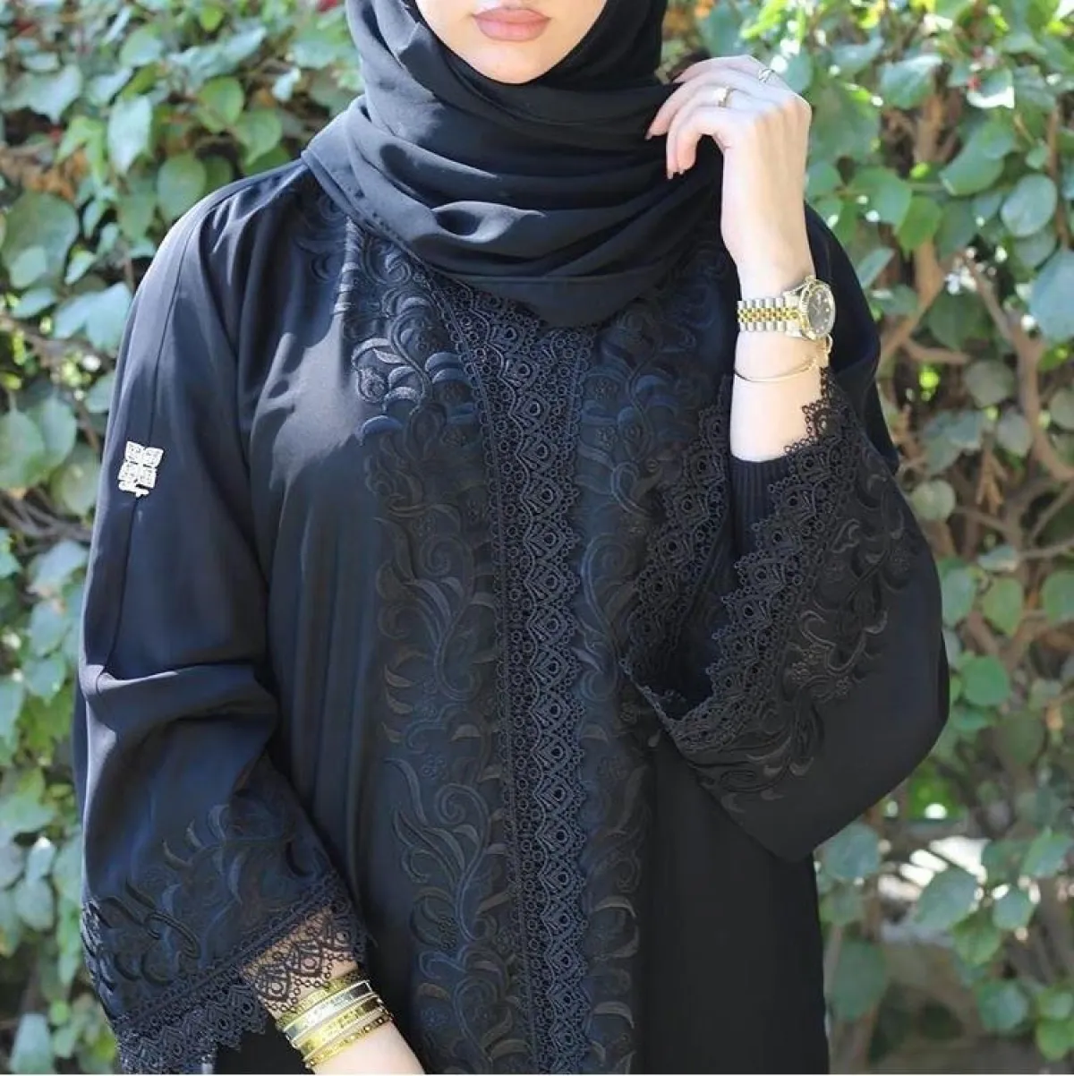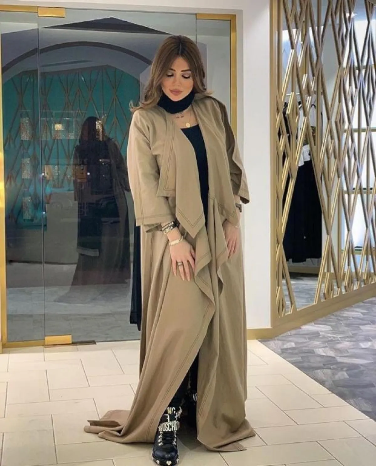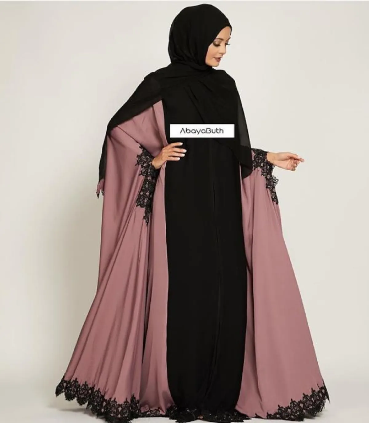 لفتنا كذلك العباية المفتوحة من Abaya Buth عبايه بوث، باللون المخملي البينك الداكن، مع التوب الأسود المناسب للتطريزات الدانتيل على الأكمام، وإطار العباية المناسبة أكثر للصبيّة الثلاثينية التي تمنحها اطلالة فخمة وراقية، نسقيها مع شوز نود يناسب لون العباية لاطلالة مخملية مكتملة.