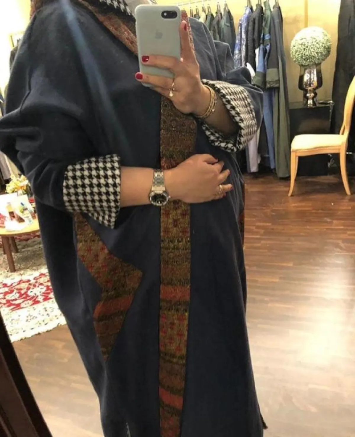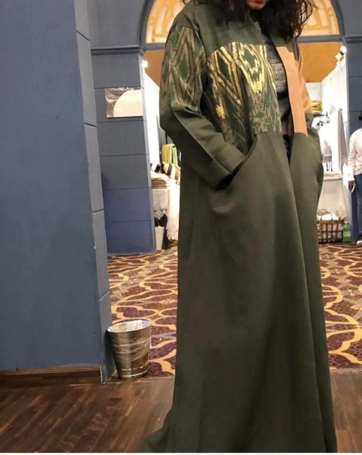 لفتنا كذلك العباية بتصميم الفراشة من تصميم عبايات راوية باجاباس Rawauaih Bagabas مع تصميم الأكمام الواسعة ورسومات القفطان الفلكلورية العربية.