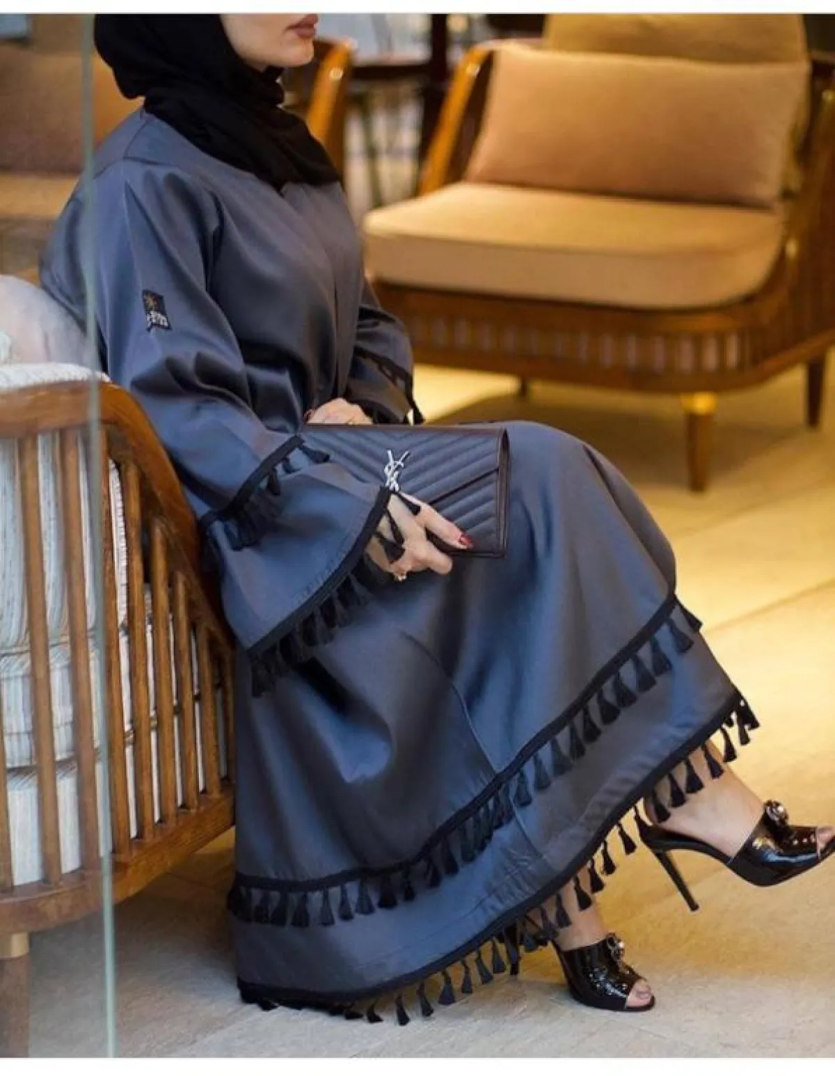العبايات بتصميم الفساتين من الموديلات التي تفضلها الصبايا كثيرًا، لأنها تجعل مظهرنّ يبدو أكثر رشاقة، كالموديل من Subhan Abaya، بالعباية باللون البترولي مع الشراشيب المربطة بـ اللون الأسود، تناسب مشاويركِ النهارية والليلية، بخاصة إذا نسقتِها مع كلتش صغير الحجم وشنطة ميني تضيف لمسة كلاسيكية لاطلالتِك.