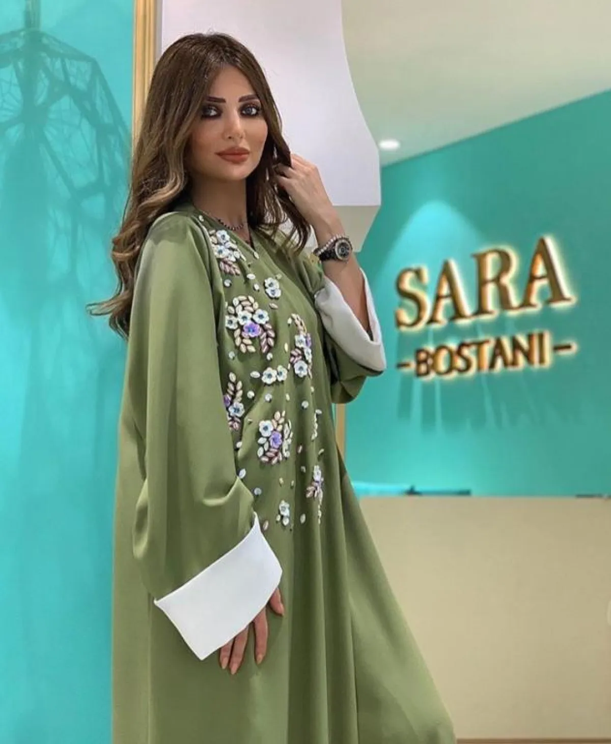 أما الألوان المخملية الدافئة فيمكنكِ اختيار اللون الأخضر الفاتح من سارة البستاني Sara Albostani، مع التطريزات بالخرز على الصدر باللون الأبيض، تناسب مشاويركِ النهائية لو نسقتِها مع قطع بألوان هادئة، أو في المساء مع الكعب العالي.