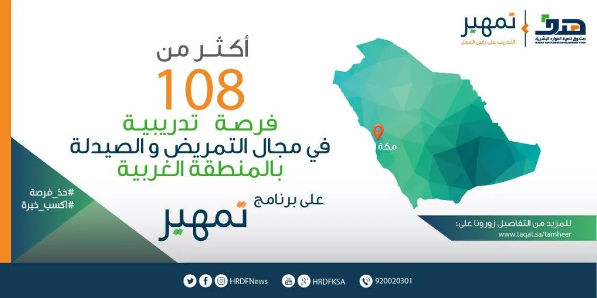 في إطار إكساب خريجي الجامعات الخبرات والمهارات اللازمة المطلوبة لسوق العمل، أتاح صندوق تنمية الموارد البشرية "هدف"، 108 فرص تدريبية على رأس العمل في مجال التمريض والصيدلية في منطقة مكة المكرمة، وذلك عبر برنامج "تمهير".