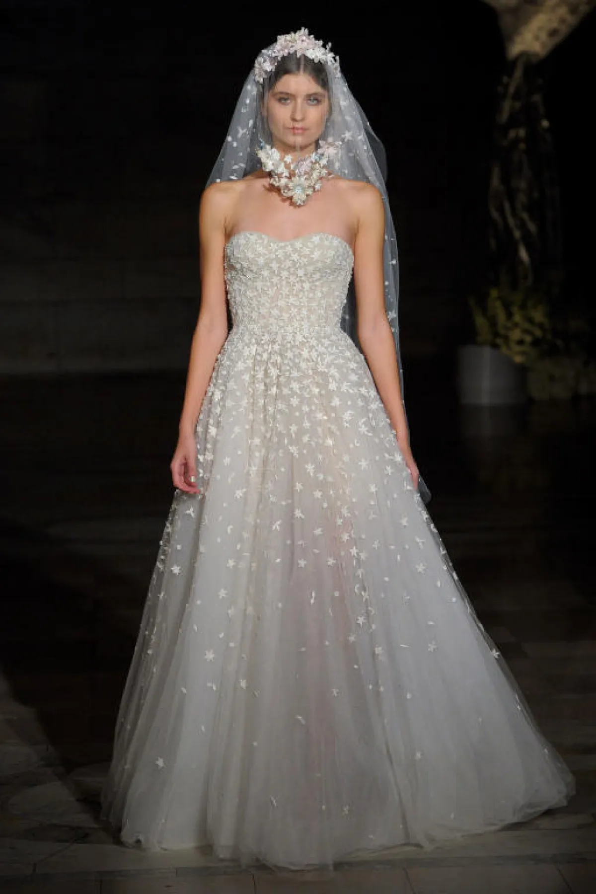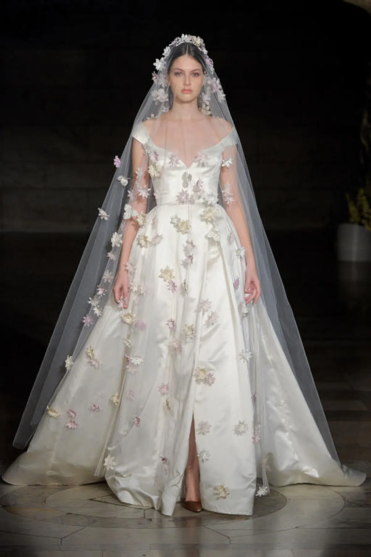 تزينت العديد من الفساتين بـ الورود البيضاء التي تمنحها طابع رومانسي ناعم، مثل فساتين ريم عكرا Reem Acra وطوني ورد Tony Ward.