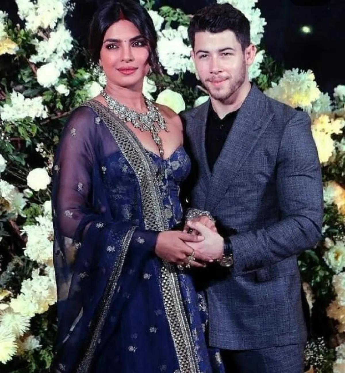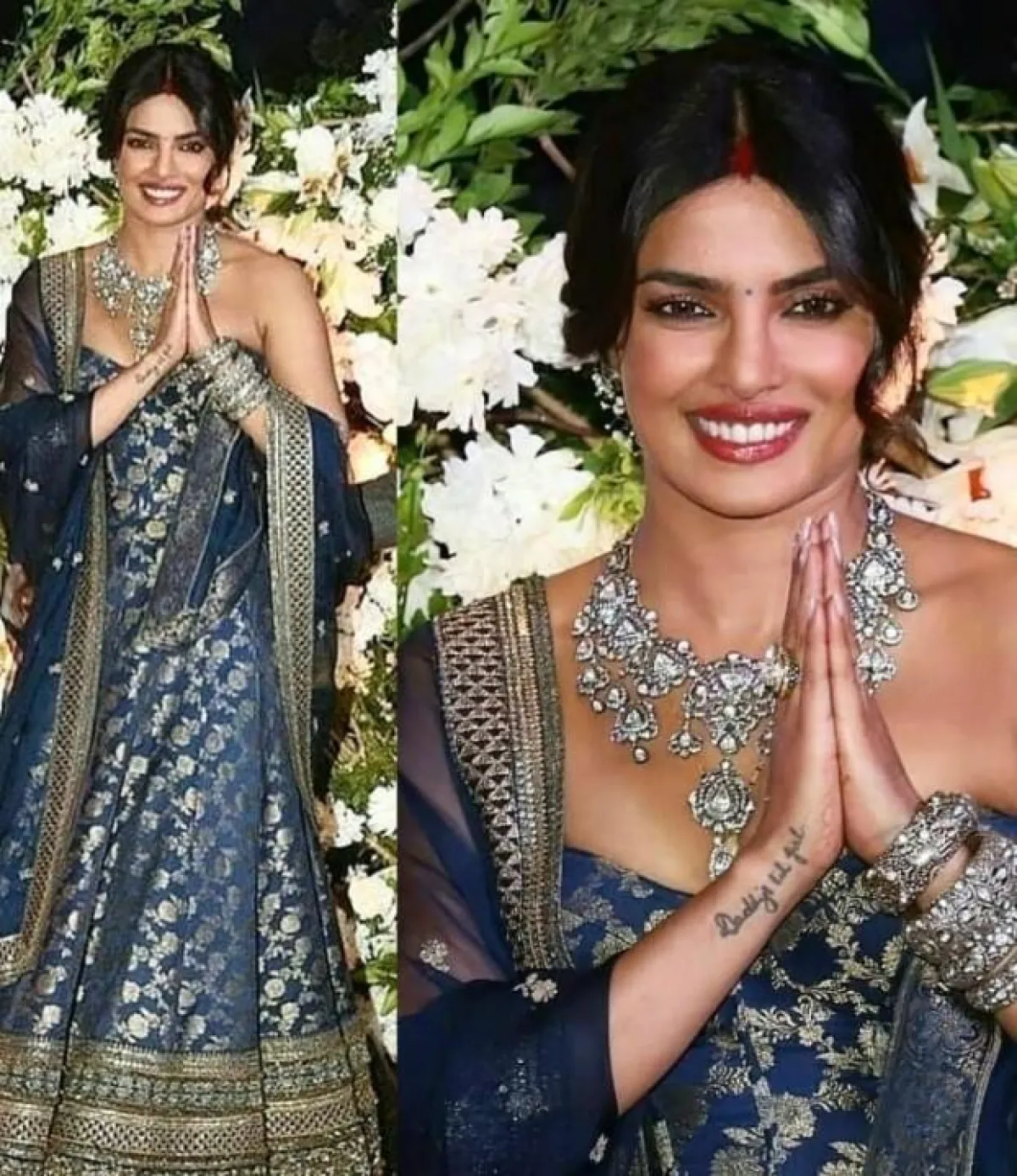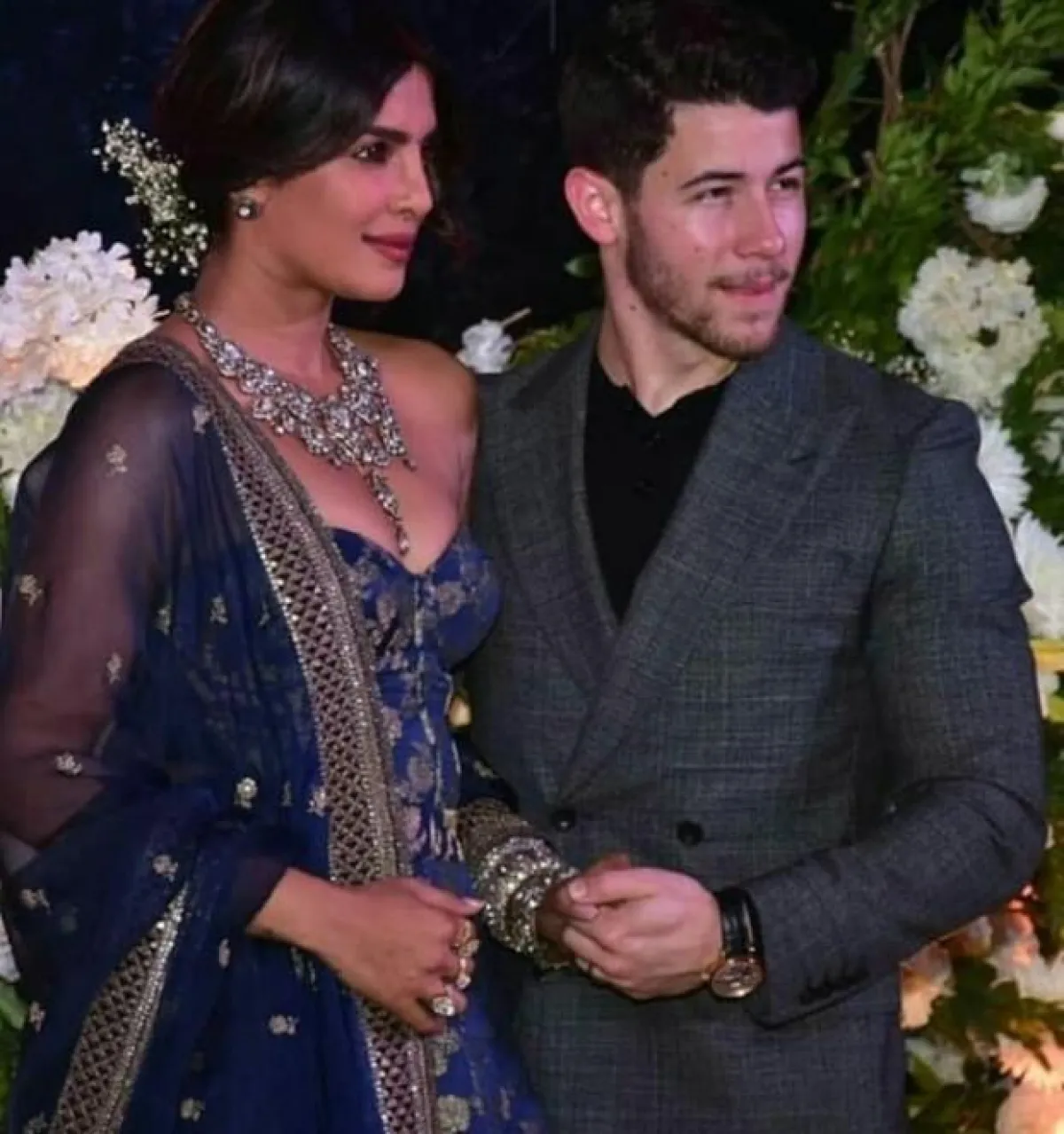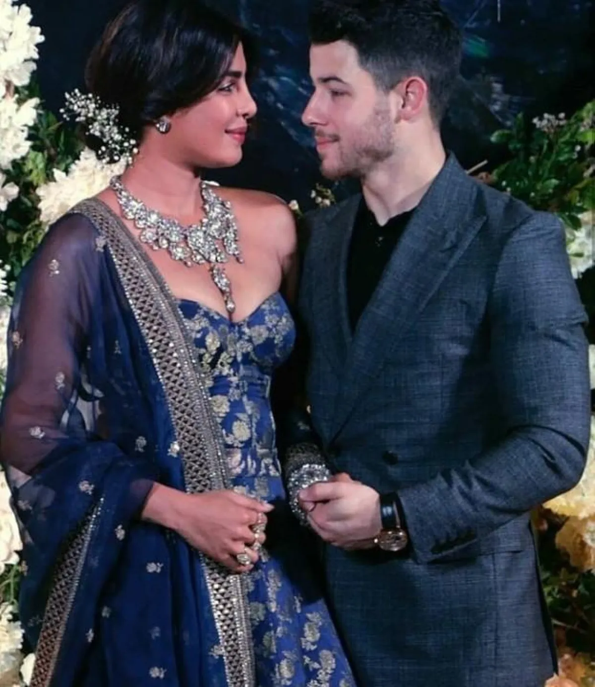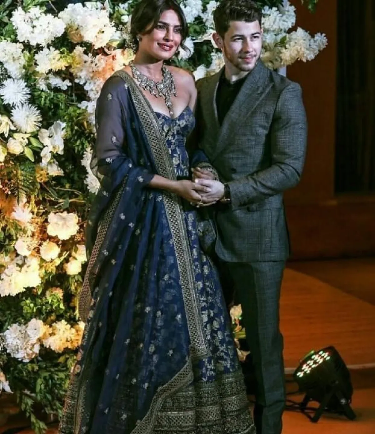 وقد لفتت العروس بريانكا النظر إليها باطلالتها الساحرة بالساري الهندي الأزرق من تصميم Sabyasachi، مع مجوهراتها الماسية اللافتة، أما زوجها نيك فظهر ببدلة رسمية باللون الرمادي.