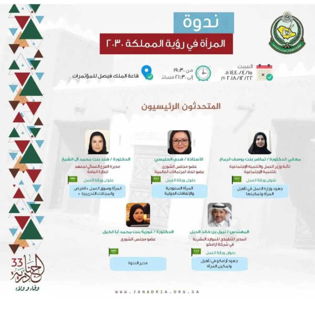 ضمن الأمسيات الثقافية في مهرجان الجنادرية، الذي يحمل هذا العام شعار "وفاء وولاء"، تقام بعد غد السبت 22 ديسمبر 2018، من الساعة 07:30 مساءً حتى 09:30، ندوة بعنوان "المرأة في رؤية المملكة 2030"، وذلك في قاعة الملك فيصل للمؤتمرات.