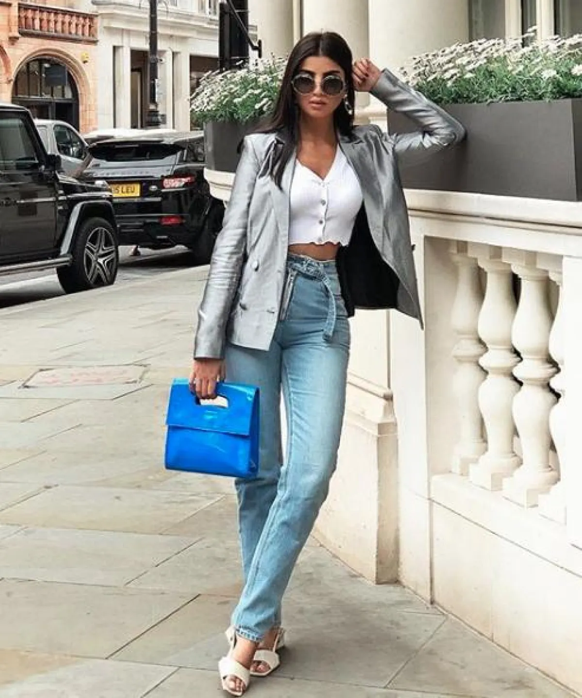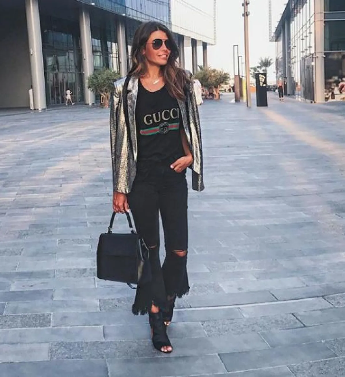 اختارت العنود بدر اطلالة عصرية اعتمدت فيها على قماش الميتالك، حيث نسقت بليزر باللون الفضي، مع تيشيرت قطنية باللون الأسود من “غوتشي” Gucci، وبنطلون جينز وحذاء كاحل، وحقيبة من الجلد، وأكملت اللوك بنظارات شمسية بقصة الـ avaitor وقد بدا اللوك مميزًا وشبابيًّا.
