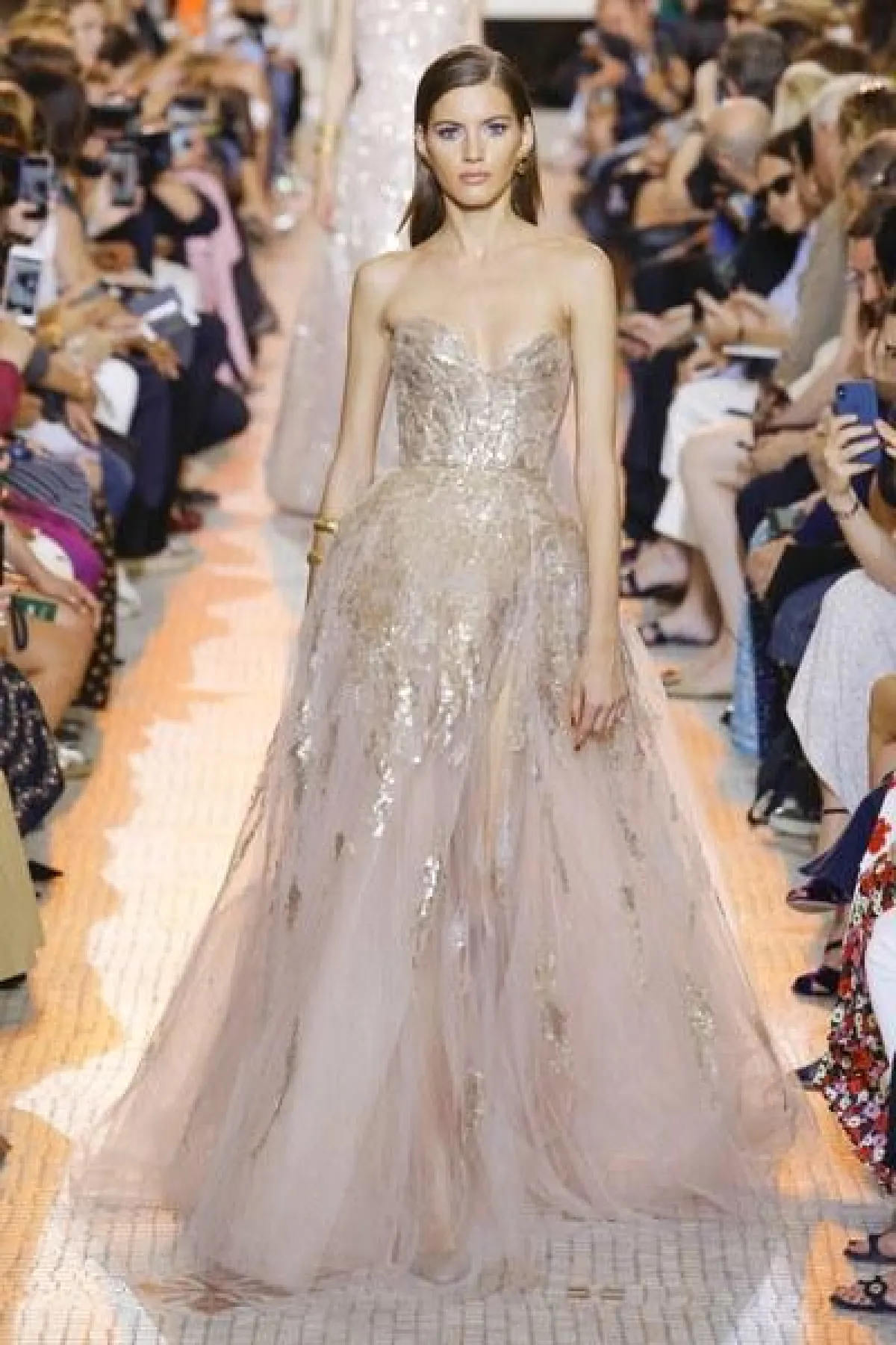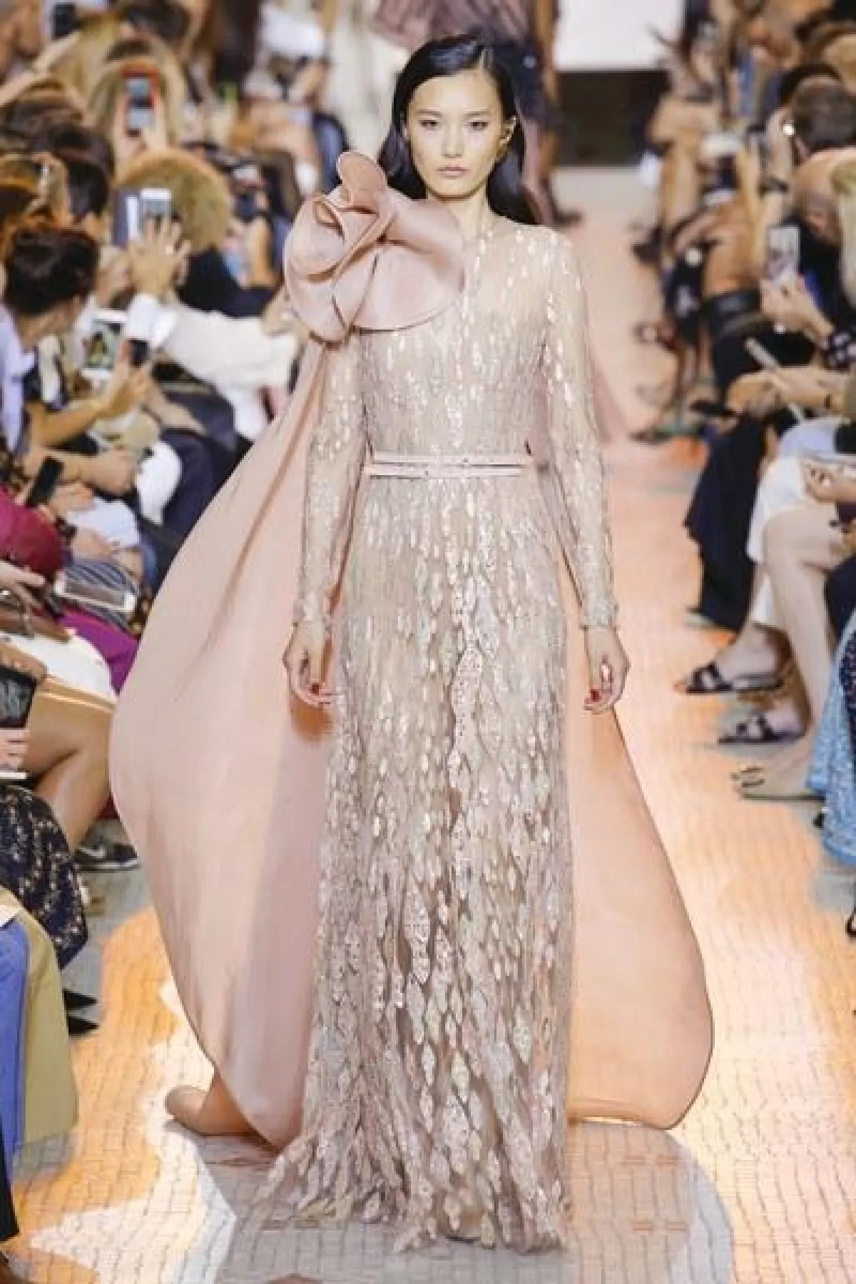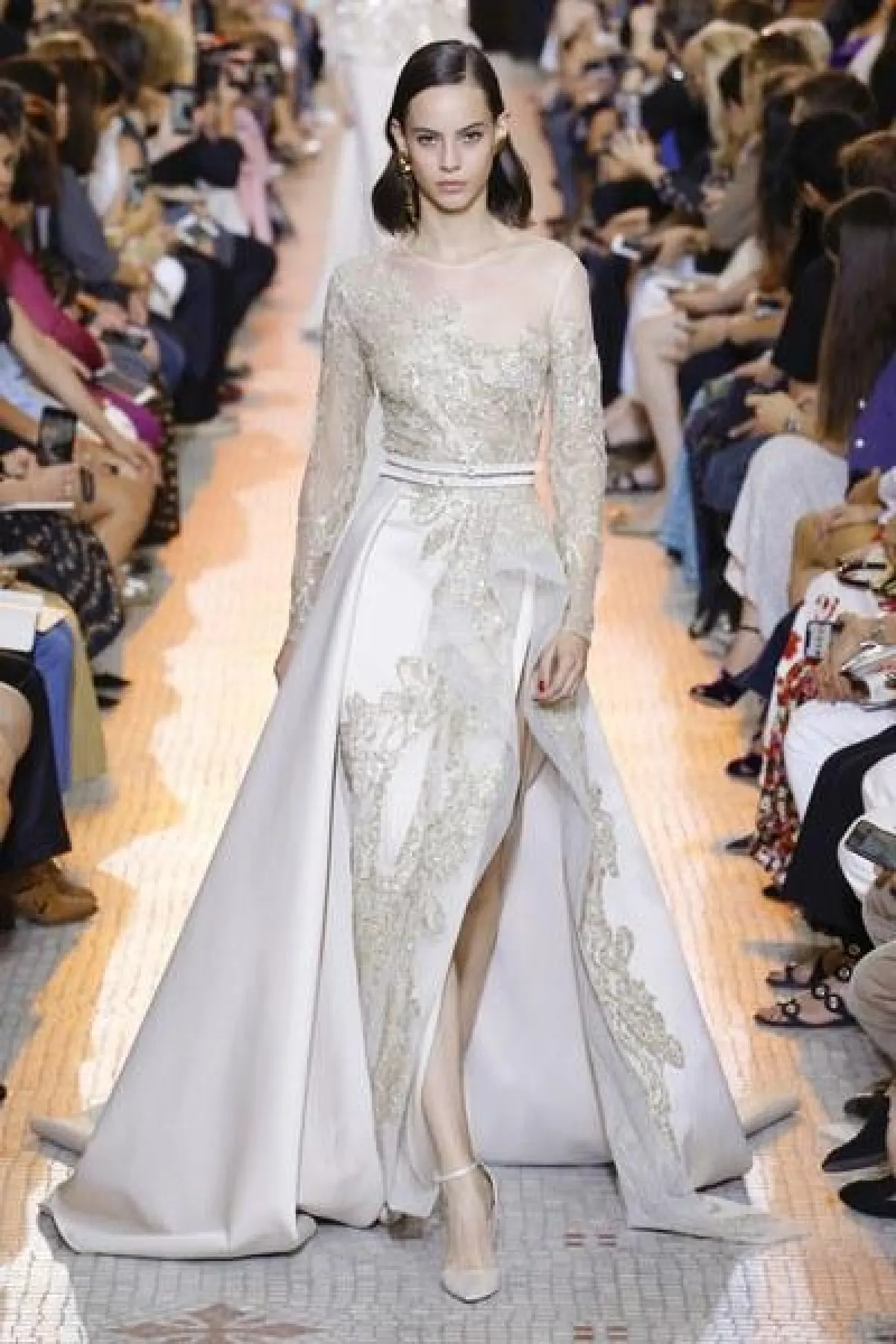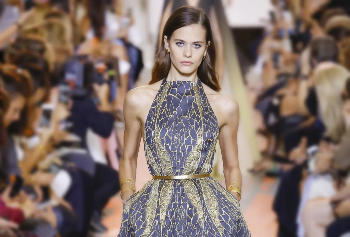 مجموعة "الكوتور" التي قدّمها إيلي صعب في 2018، تقوم على تناسق الألوان المحايدة مع نغمات الأحجار الكريمة.