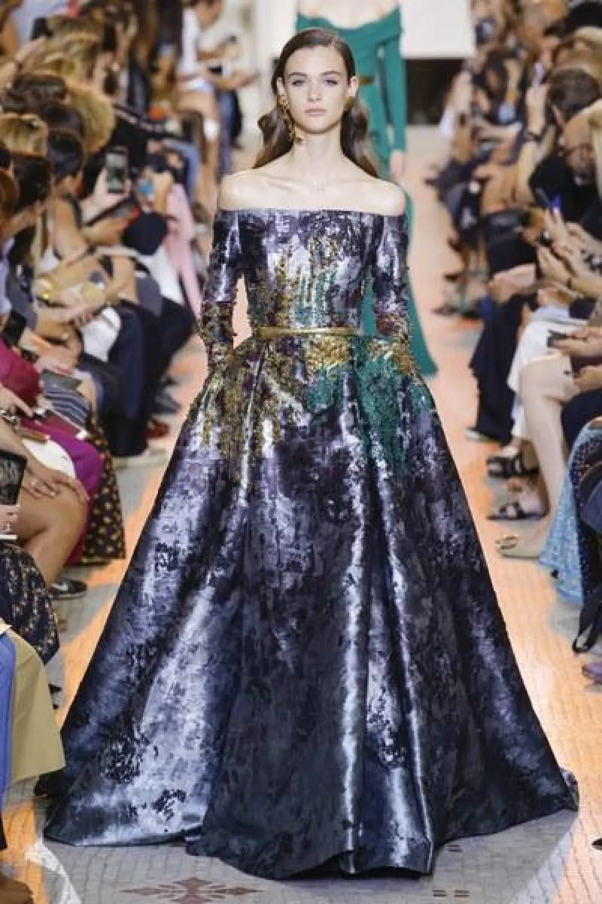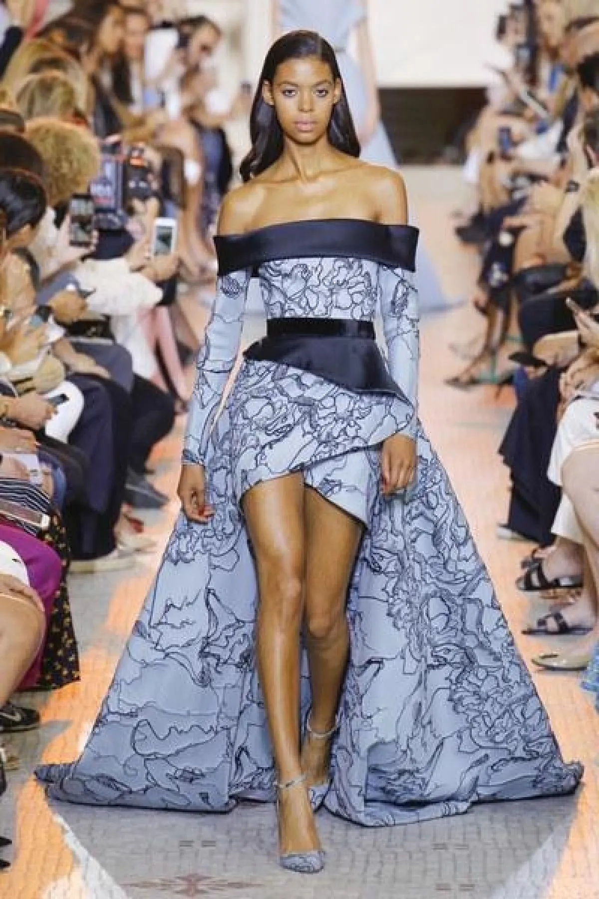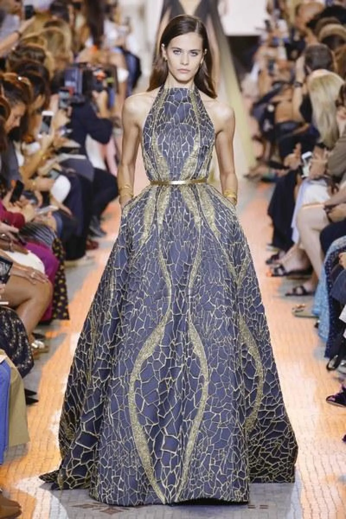 مجموعة "الكوتور" التي قدّمها إيلي صعب في 2018، تقوم على تناسق الألوان المحايدة مع نغمات الأحجار الكريمة.